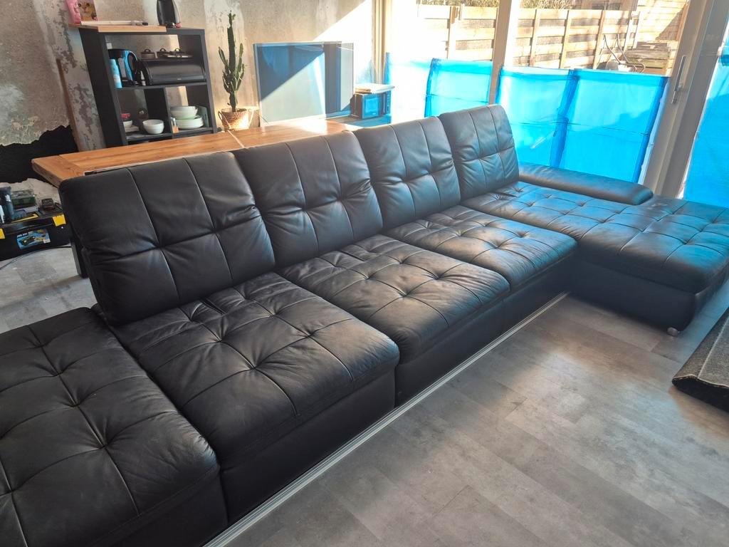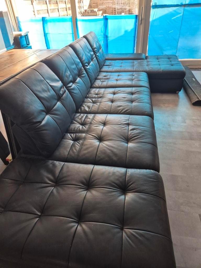 Goed uitziende echt lederen l bank nergens kapot gaat weg ivm levering nieuwe bank. 415X120 totale lengte (loungegedeelte 180x120)