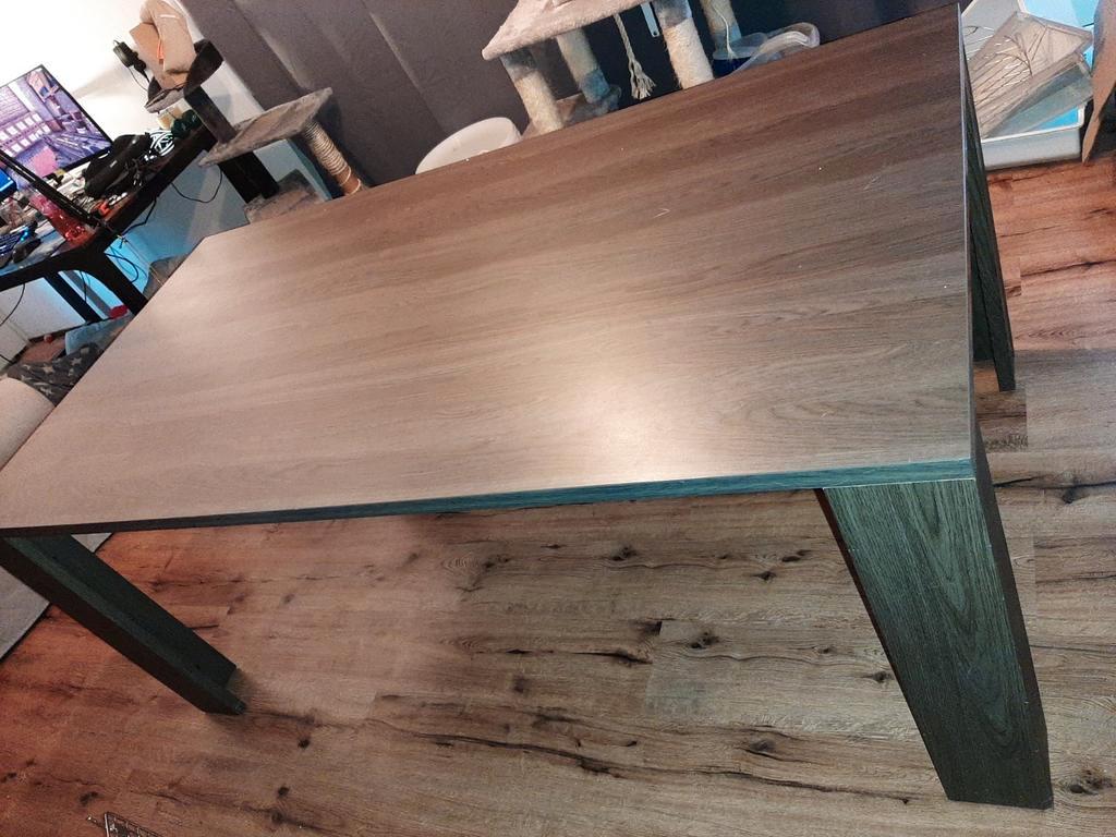Gratis eettafel aangeboden wegens verhuizing. Afmetingen: l180 x b95 x h74,5 cm. Blad is 3 cm dik. De poten zijn demontabel. De poot in de foto is makkelijk te repareren, maar daar heb ik ivm verhuizi