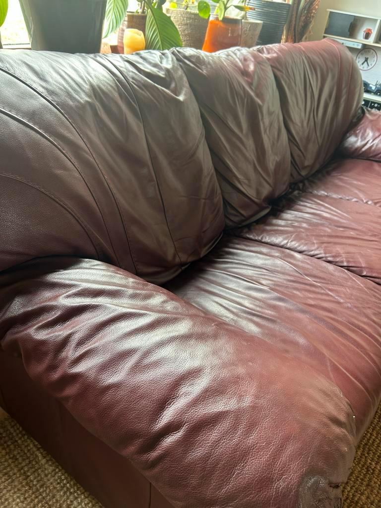 Gratis op te halen: een comfortabele 3-zits bank van leer in een unieke bruin/paars/bordeaux kleur. De bank is gebruikt, maar nog in hele goede staat. Ideaal voor een studentenkamer, starters woning o