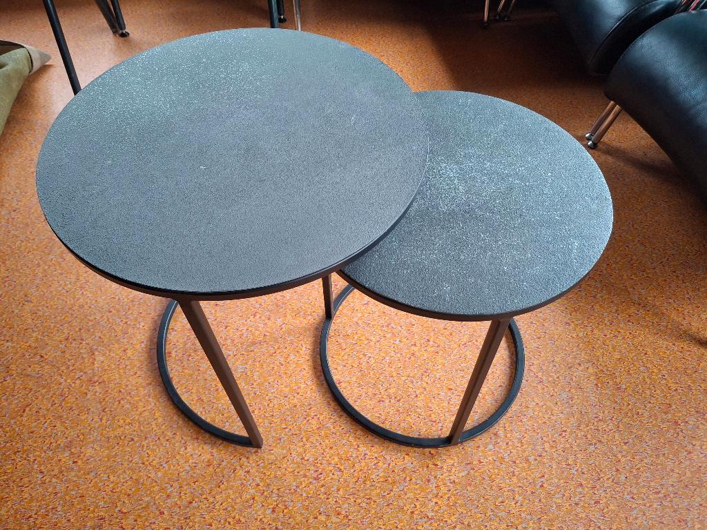 Set van 2 bijzettafels, gratis af te halen. Tafeltjes hebben wel wat beschadigingen. Afmeting "grote" tafel, 52 cm hoog en doorsnede blad 49,5 cm. Afmeting "kleine" tafel, 47 cm ho
