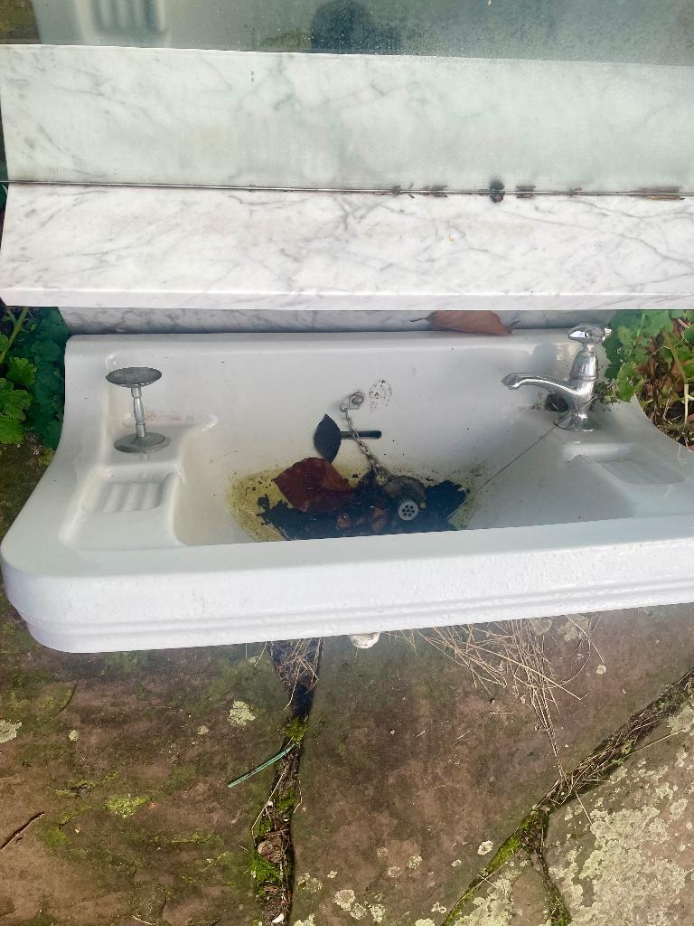 Gratis ophalen oude wastafel met spiegel en planchet marmer zoals te zien op foto, zit er een barst aan de onderkant van de wastafel