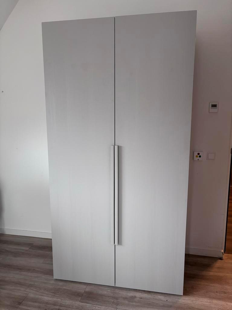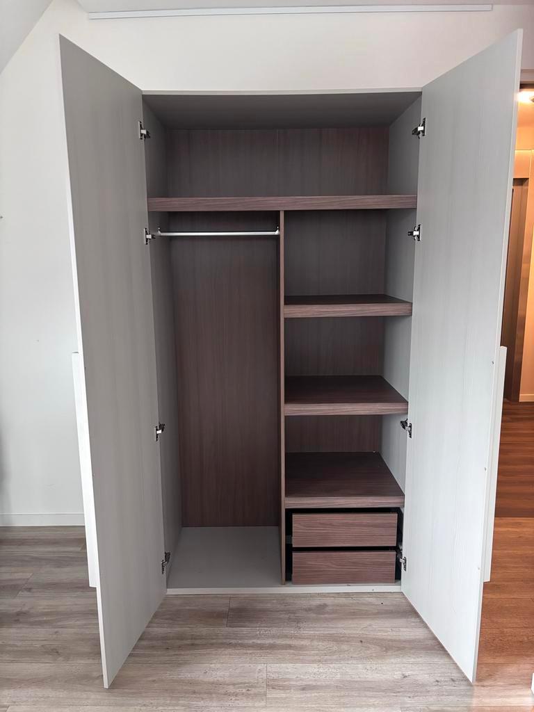 De kast is gedemonteerd (laatste foto) en kan opgehaald worden in leersum. Mooie, ruime kledingkast in grijze en bruine tinten. De kast is voorzien van deuren, lades en planken, waardoor er voldoende