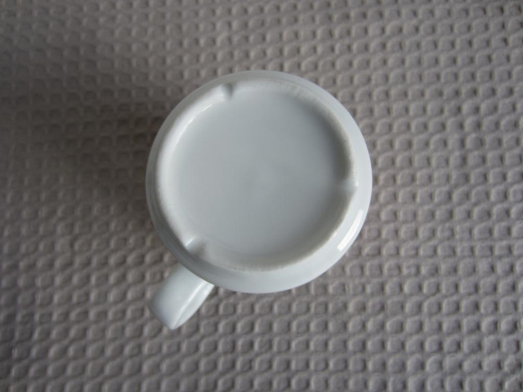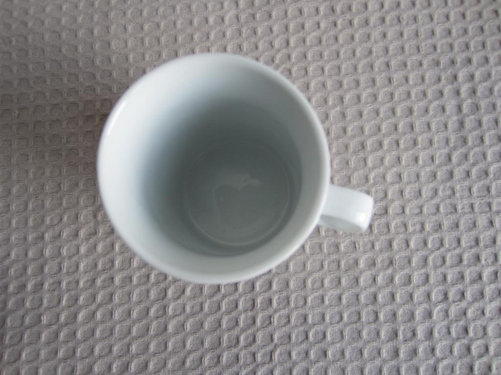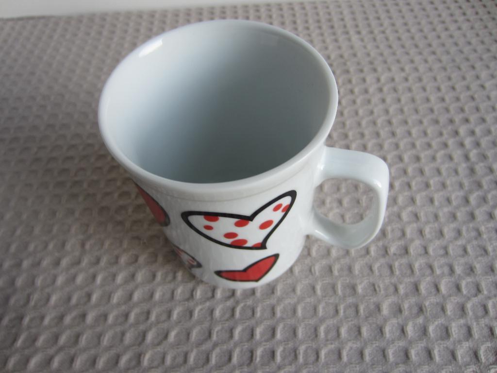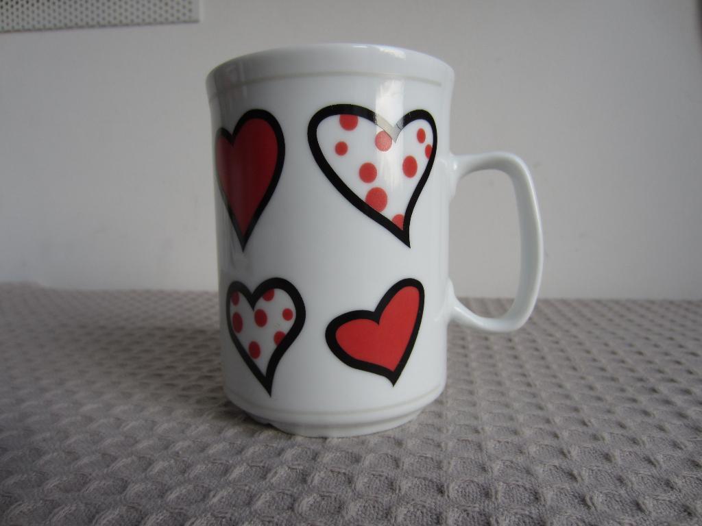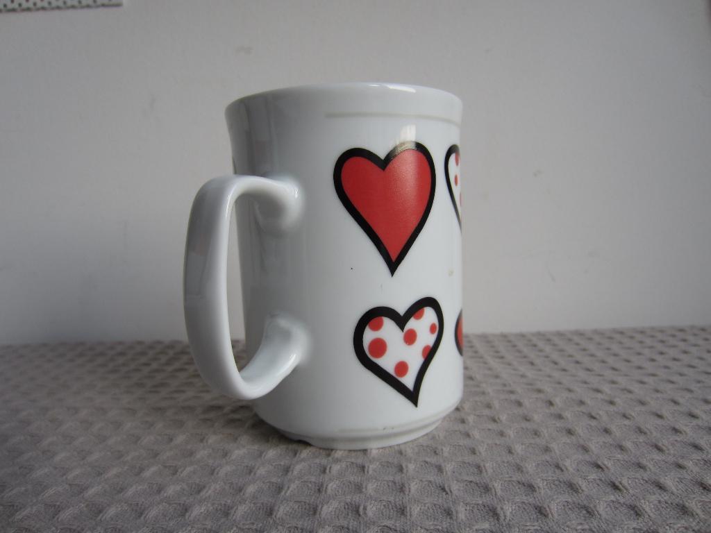 Gratis witte beker met hartjes. Nauwelijks gebruikt. Hoogte 9,5 cm, diameter 7,2 cm. Aardewerk? Zou ook porselein kunnen zijn (smalle rand). Verzenden kan, liefst met nog iets anders uit de opruiming