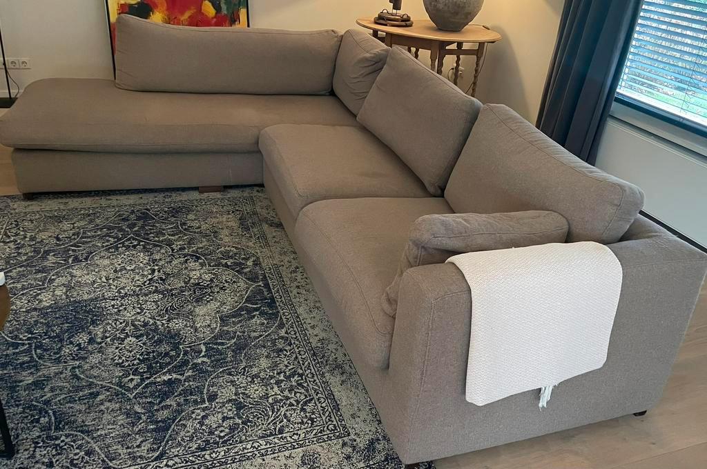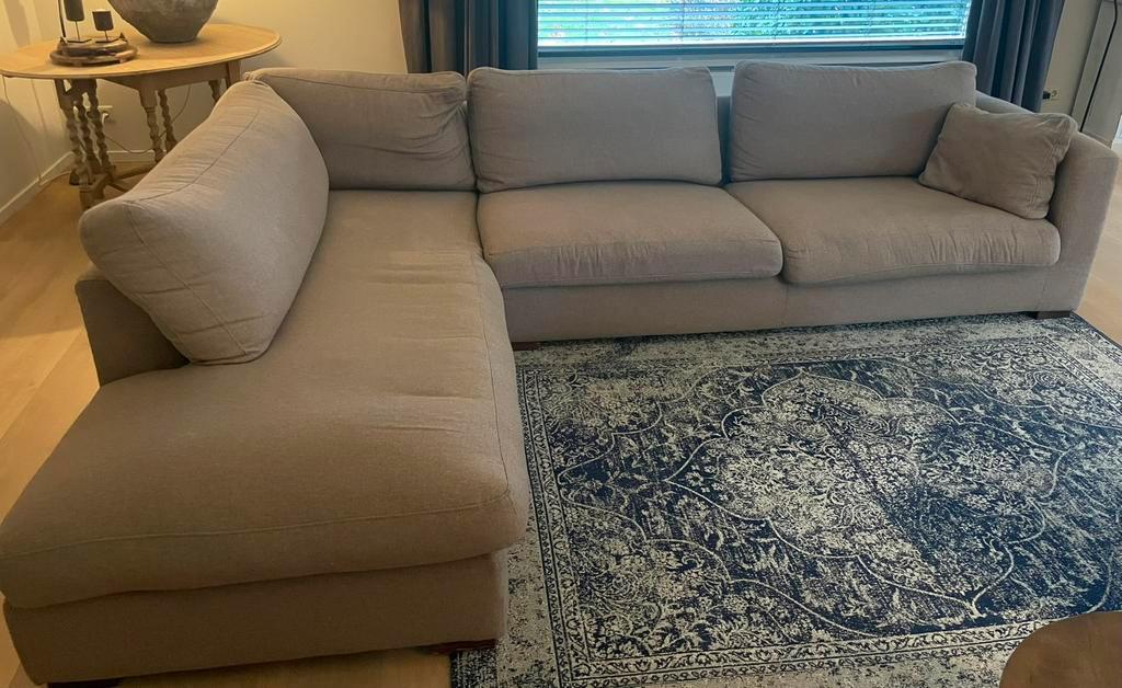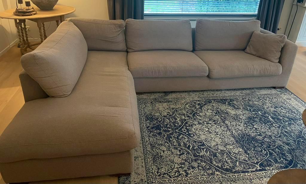 Beige stoffen hoekbank. 210X83x297cm (bhd). Alle kussens hebben afhaalbare hoezen en kunnen gewassen worden. Gebruikt maar kan zeker nog een ronde mee. Moet weg ivm verhuizing. Bij voorkeur ophalen op