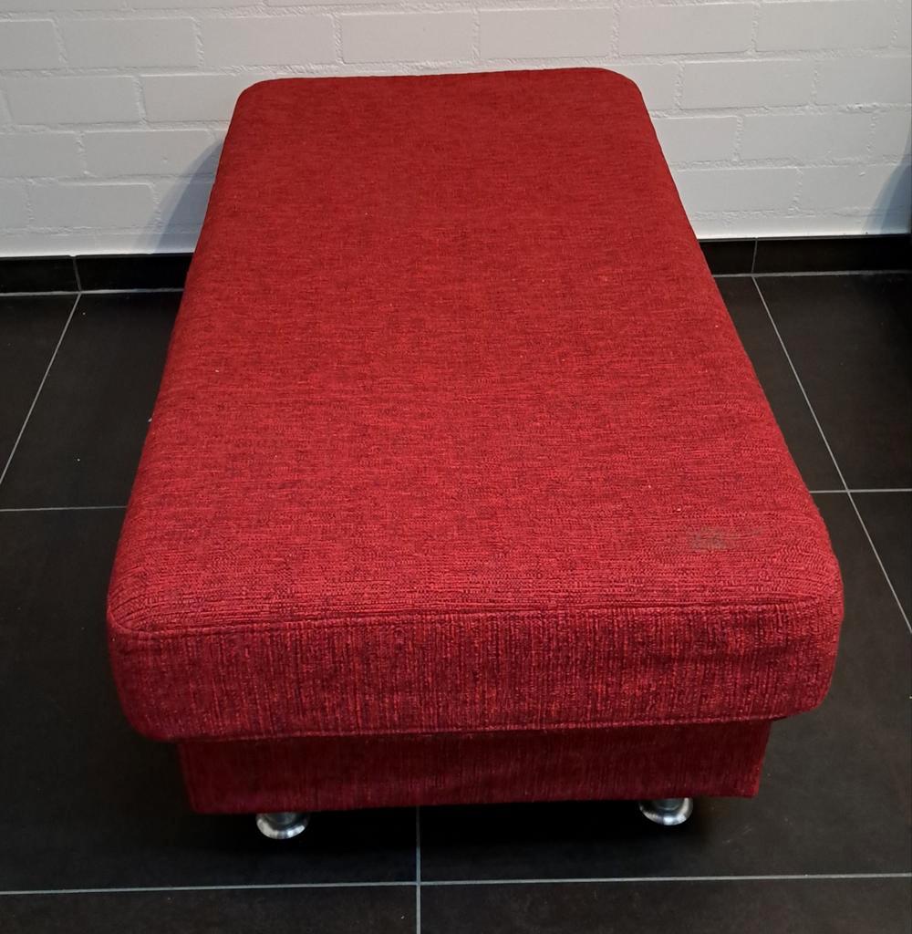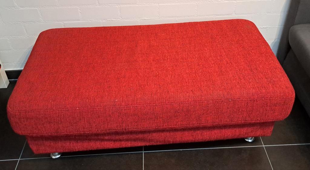 Poef / bankje in rode stof en met rvs pootjes. Afmetingen: 117cm lang x 62cm breed x 41cm hoog. Hier overbodig geworden. Gratis op te halen.