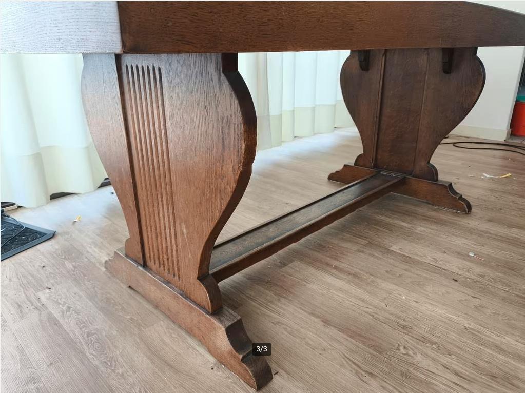 Mooie eetkamerset, antiek. Oerdegelijk en heel mooi ouderwets geconstrueerd. Stoelen met bordeaux rode velour bekleding. 84X176cm. ÇA. 80Cm hoog.