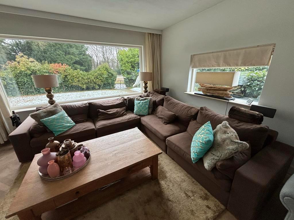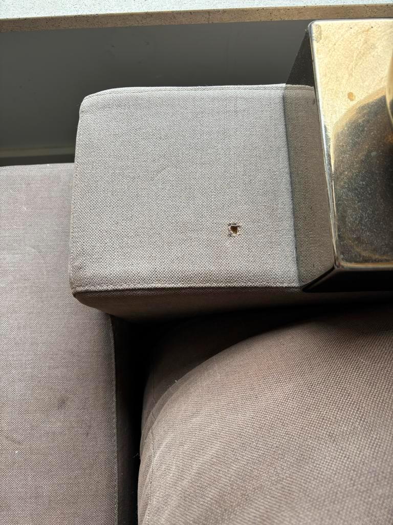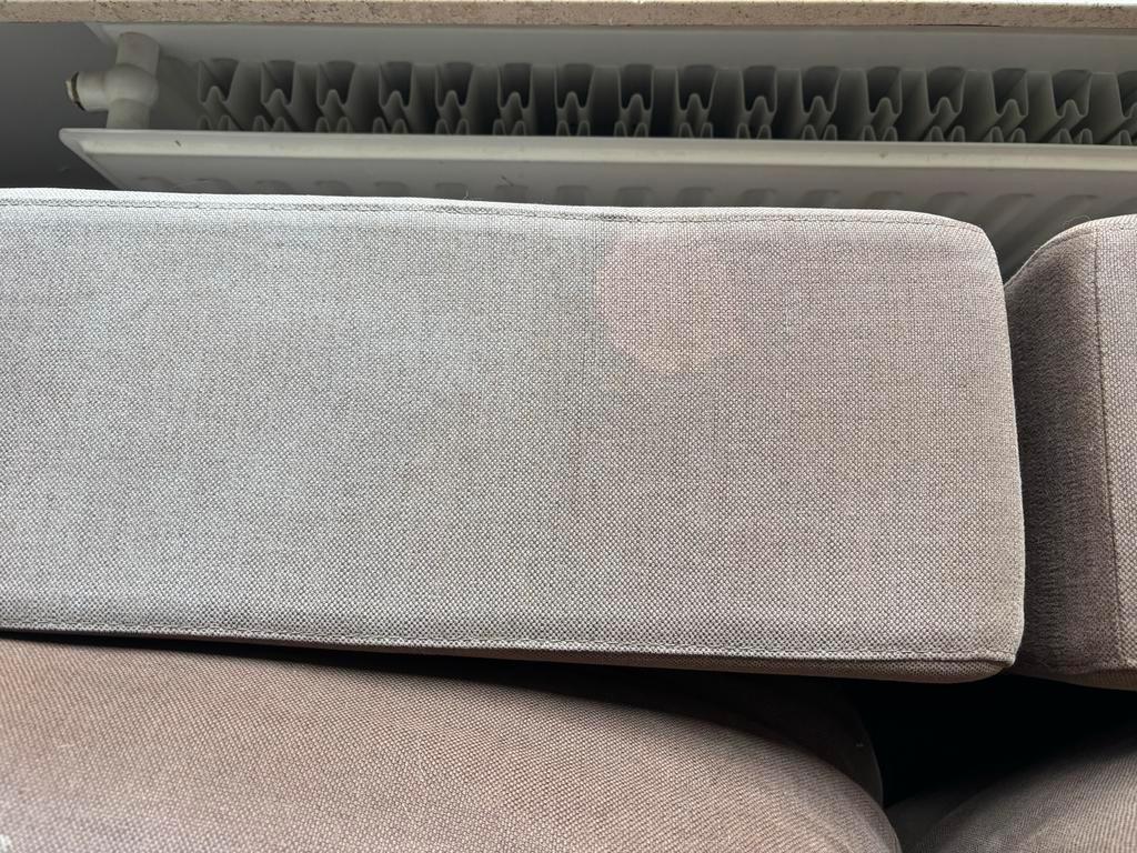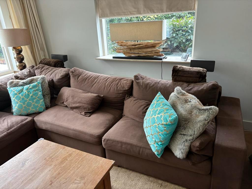 Comfortabele, ruime bruine hoekbank. Perfect voor een groot gezin of om lekker op te loungen. De bank is gebruikt, heeft een kleine schade op de rug van een hoekdeel, de stof heeft verkleuren en vlekk
