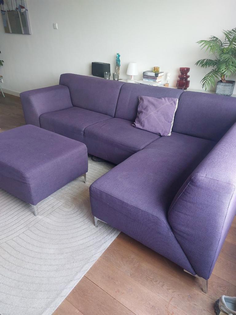 Comfotabele paarse zitbank 270×150×85 cm en hocker 85x65 cm. Gratis af te halen tot 1 maart
