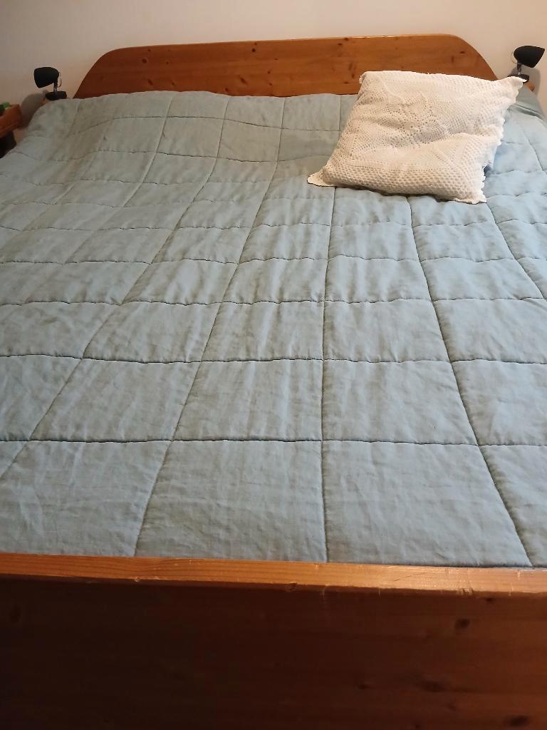 Massief grenen ledikant, met elektrische verstelbare lattenbodem. Afmetingen: 180 x 200 cm. Eventueel makkelijk te verlengen naar 210 cm. Buitenmaten: 186 x 216 cm. Hoofdwand is 90 cm hoog, het voeten