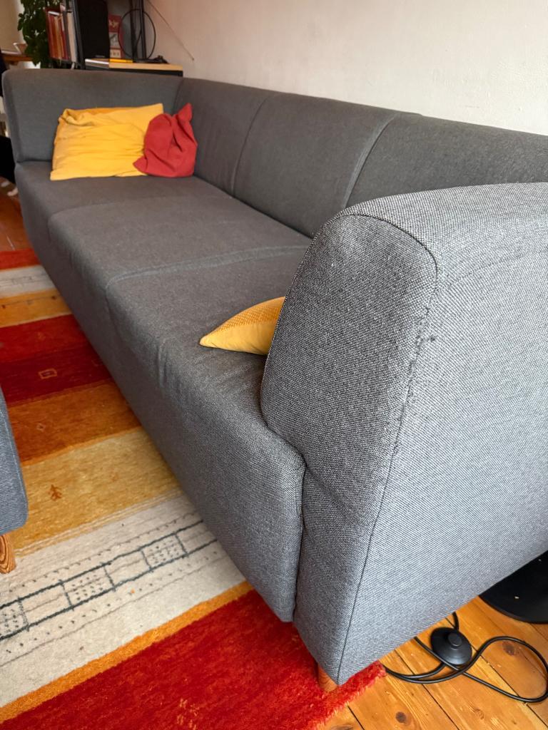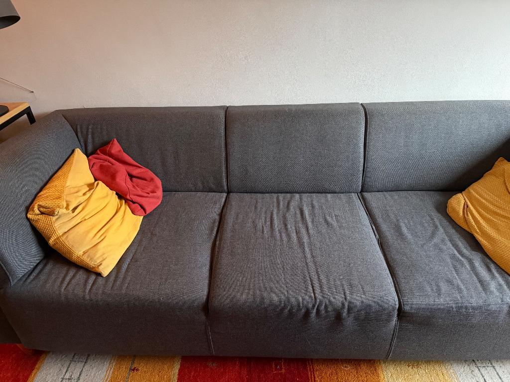 Grijze 3-zitsbank. Hoogte 75 cm, diepte 85cm, lengte 225cm. De poten zijn van hout.