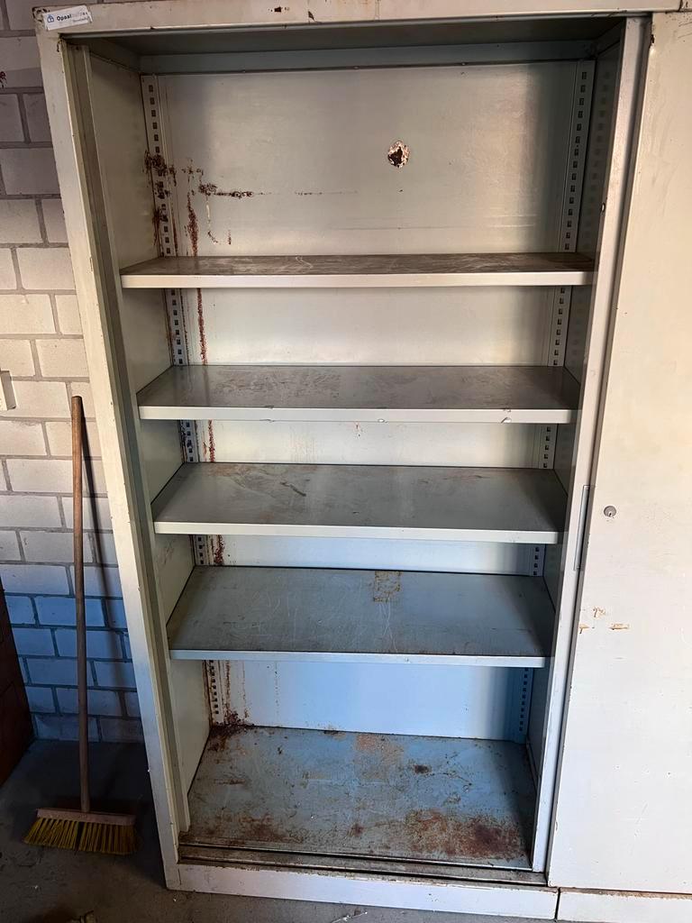 (gratis, zelf ophalen/ versjouwen, alleen in de weekenden) een gebruikte stalen kast met schuifdeuren. De kast heeft enkele gebruikssporen en roestplekken, maar is verder in goede staat. Ideaal voor o