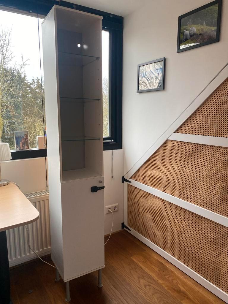 Witte, smalle kast met glazen planken. Ideaal voor kleine ruimtes. De kast biedt veel opbergruimte voor een smalle plek. De kast heeft een deur en planken. De kast is 30 cm breed, 1,82 hoog en 30 cm d