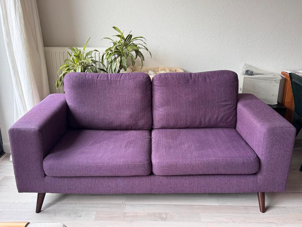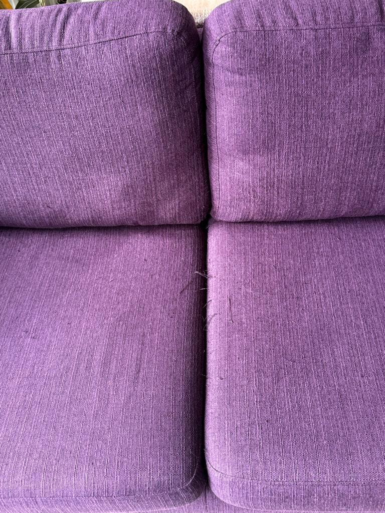 Gratis paarse bank af te halen in huizen. De bank is lichtelijk beschadigd door een kat (zie foto''s). Verder zit de bank nog prima. Gaat weg wegens aanschaf van een nieuwe bank. Breedte 200 cm die