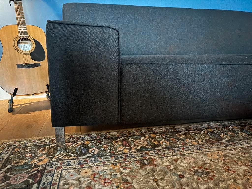 Donkergrijze hoekbank lange zijde 270 cm korte zijde 210 cm 90 cm diep (60 cm zitvlak) ca 74 cm hoog merk montel gebruikt, in goede staat