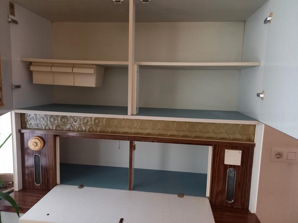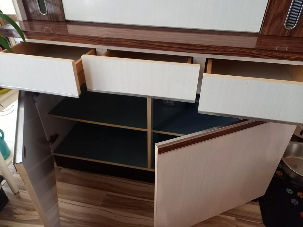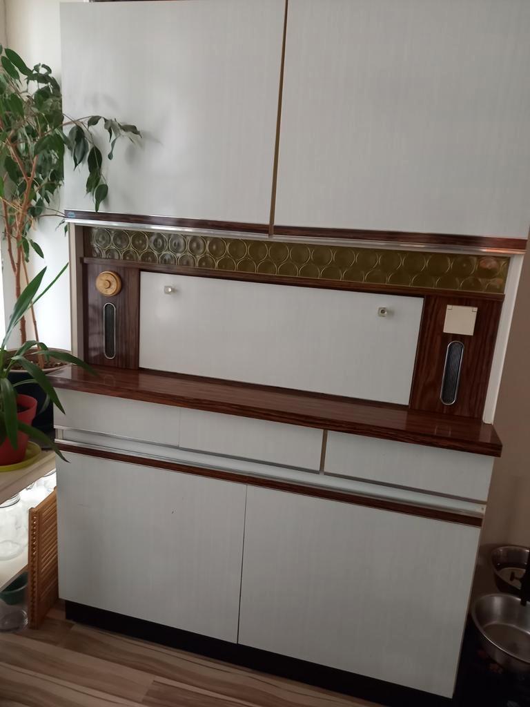 Vintage buffetkast, 2 delig. Ongeveer 180cm hoog, 120cm breed, 50cm diep. Best redelijke staat, zéker gezien de leeftijd. Uiteraard wel gebruikerssporen. Het lampje in t klepgedeelte en het stopcontac