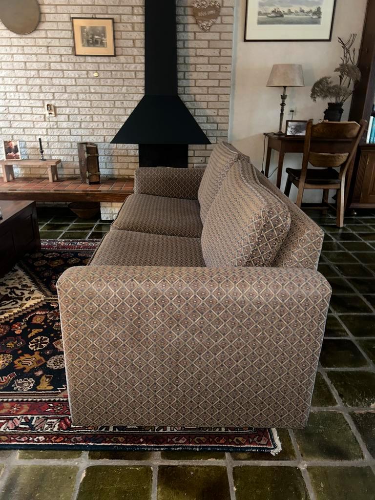 Deze comfortabele en elegante bank is bekleed met een mooie stof. De bank biedt plaats aan meerdere personen en is perfect voor een gezellige zithoek. De bank is in goede staat en klaar voor gebruik.