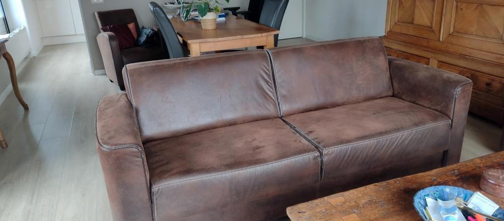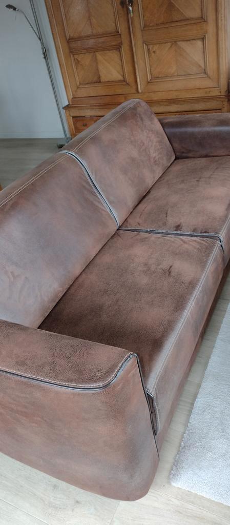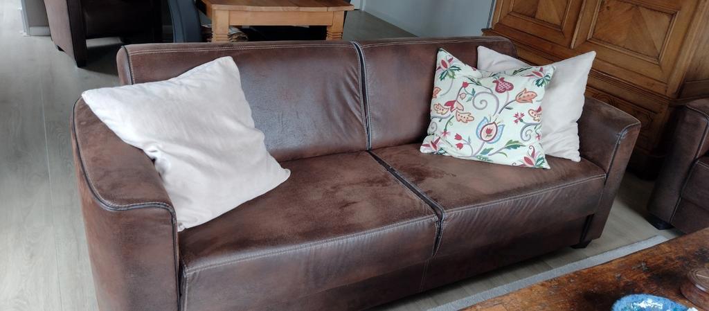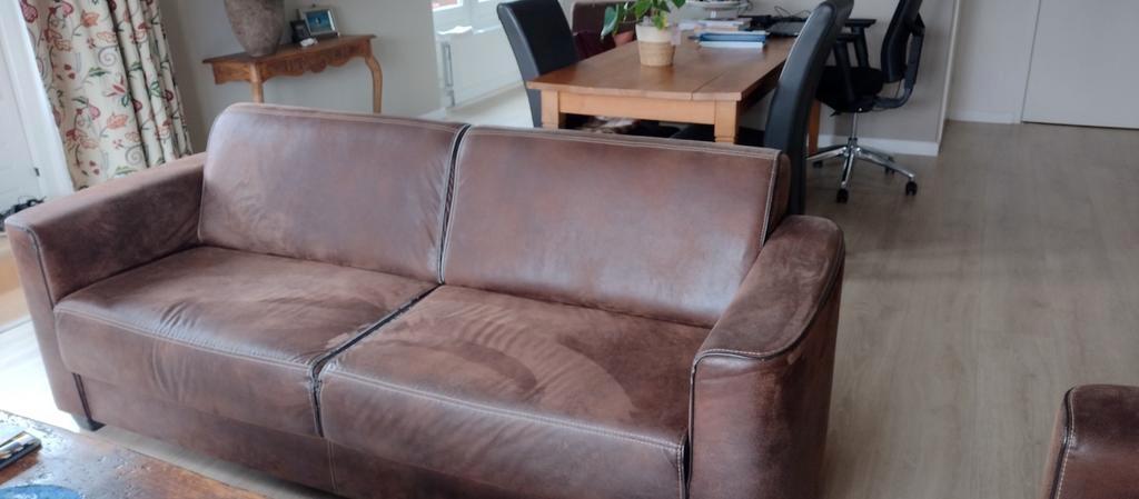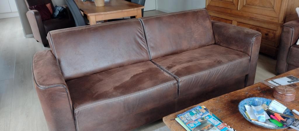 Deze 3 zitsbank moet helaas weg wegens plaatsgebrek door persoonlijke omstandigheden. De bank is 220 cm breed, 80 cm diep, 44 cm zithoogte. De kleur is bruin. In het bekledingsmateriaal zit een vleug,