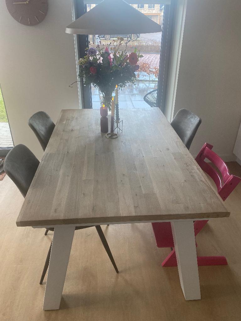 Eettafel voor 4 personen. Kan verlengd worden voor 6 personen. Incl 4 eettafelstoelen (excl. Triptrapstoel) lengte 160 cm breedte 100 cm hoogte 76 cm