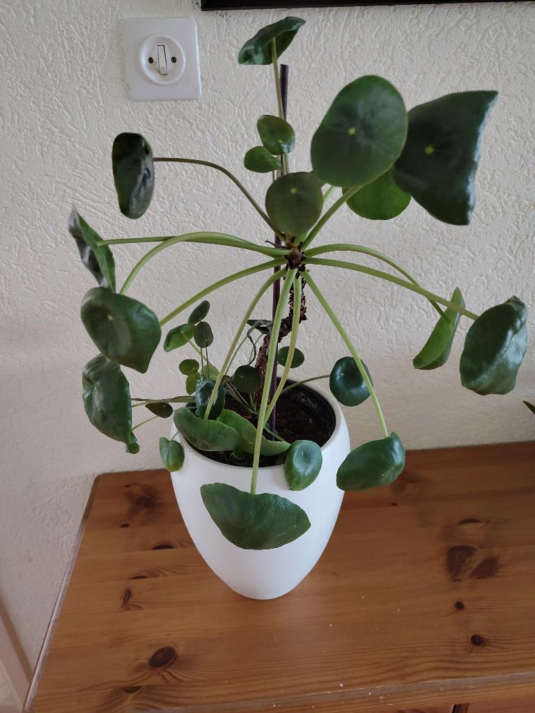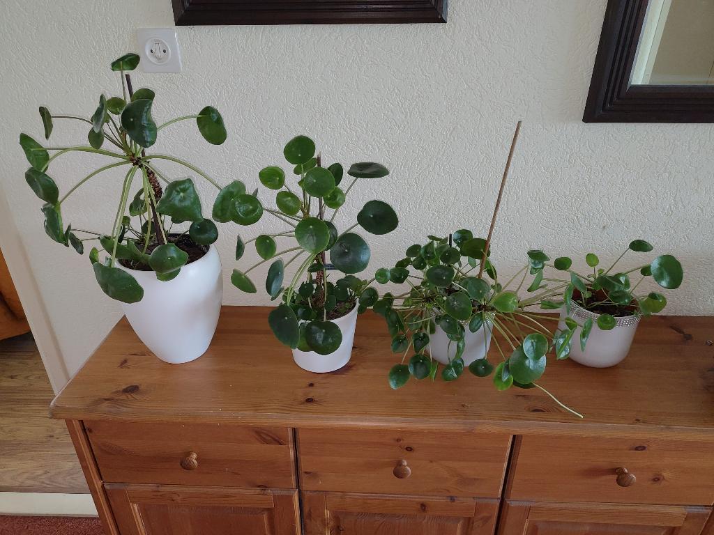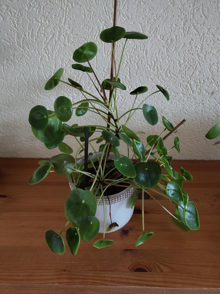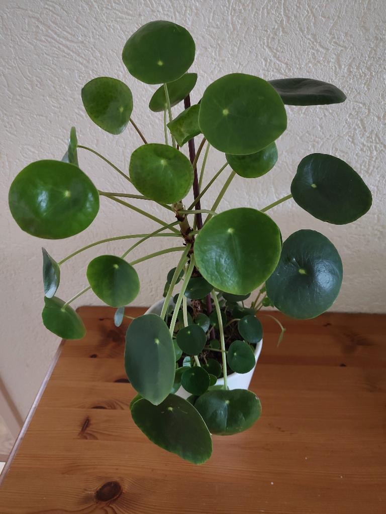 Pannenkoekplant (pilea peperomioides) 1x per week water geven. Ik heb er vier.