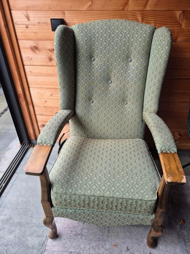 Comfortabele, gebruikte fauteuil met oren. De stoel is bekleed met stof en heeft houten armleuningen en poten. Ideaal voor een gezellige zithoek. De conditie is gebruikt, maar nog in goede staat.