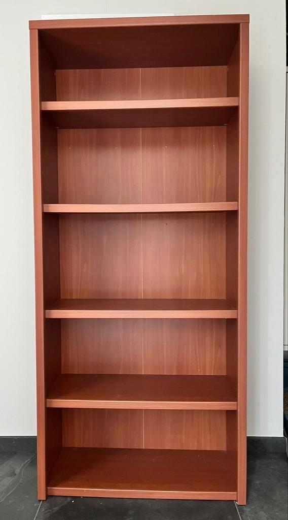 Twee identieke boekenkasten in kersen kleur. Afmetingen: 80 cm breed, 180 cm hoog en 35 cm diep. Gratis op te halen. Let op: 1 kast heeft een rond boorgat in het middelste vak, gemaakt voor kabels van