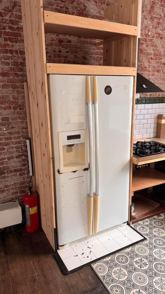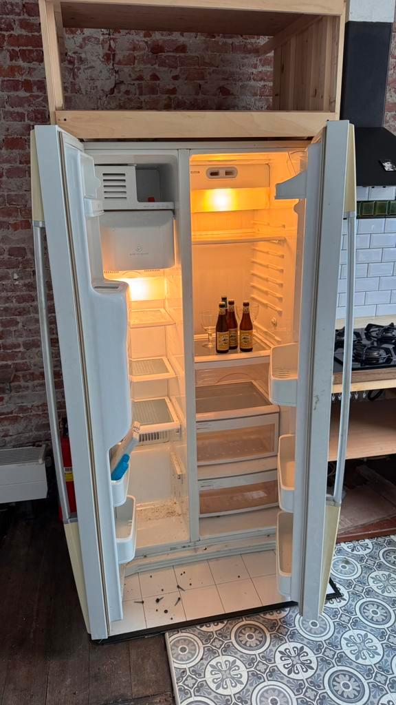 Koelkast, overgenomen met de koop van een huis. Hij koelt, en geeft koud water en ijsblokjes. Amerikaanse koelkast.