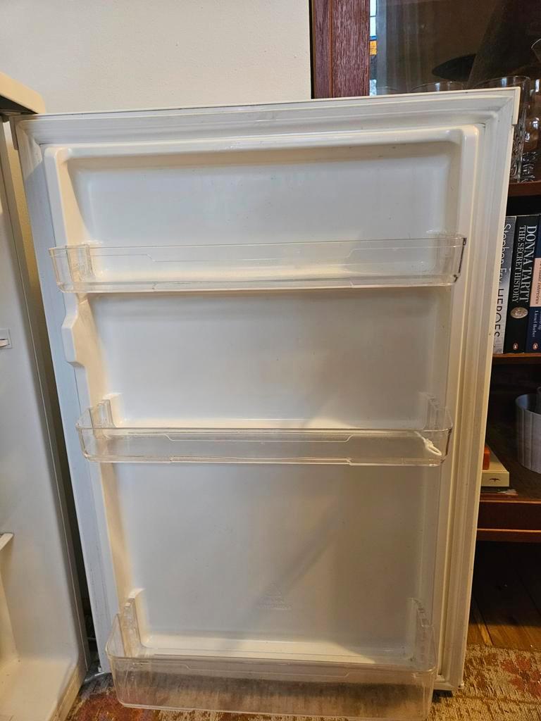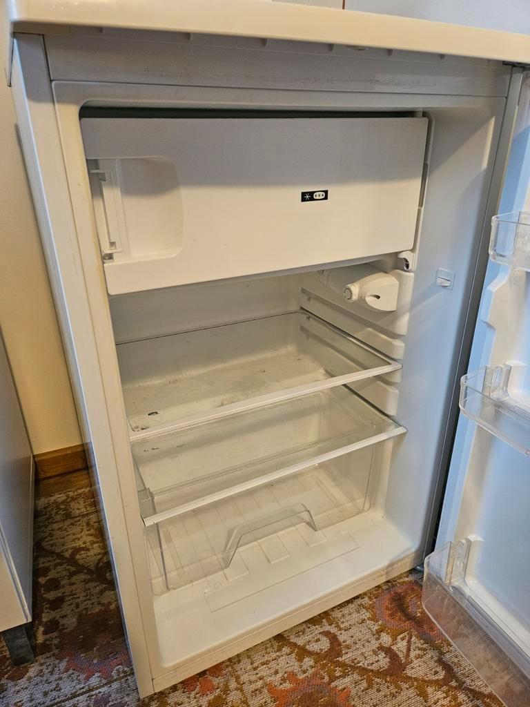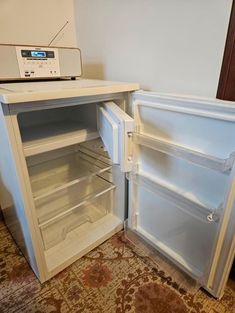 Handige tafelmodel koelkast, ideaal voor kleine ruimtes. Perfect voor studentenkamers, kantoren of als extra koelkast. Gebruikssporen aan de buitenkant, maar schoon van binnen. Klepje van het vriesvak