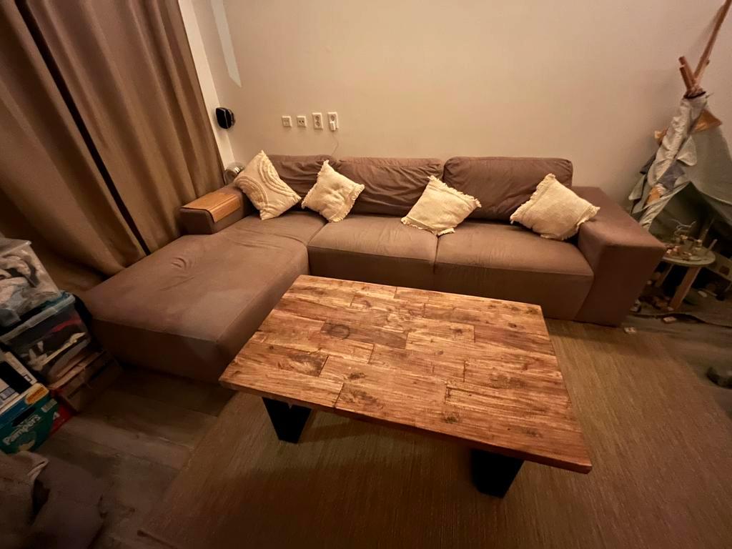Lengte 305 cm gebruikte bank, leuning links doorgezakt. Aantal vlekken op de bank.