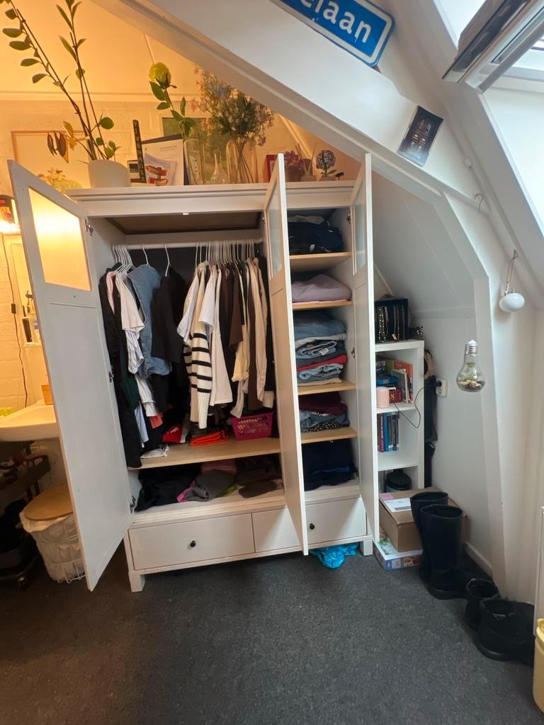 Witte kast met deuren en lades. De kast is in goede staat en biedt veel opbergruimte. Ideaal voor kleding, boeken of andere spullen. Afmetingen zijn geschat, zie foto''s voor details.