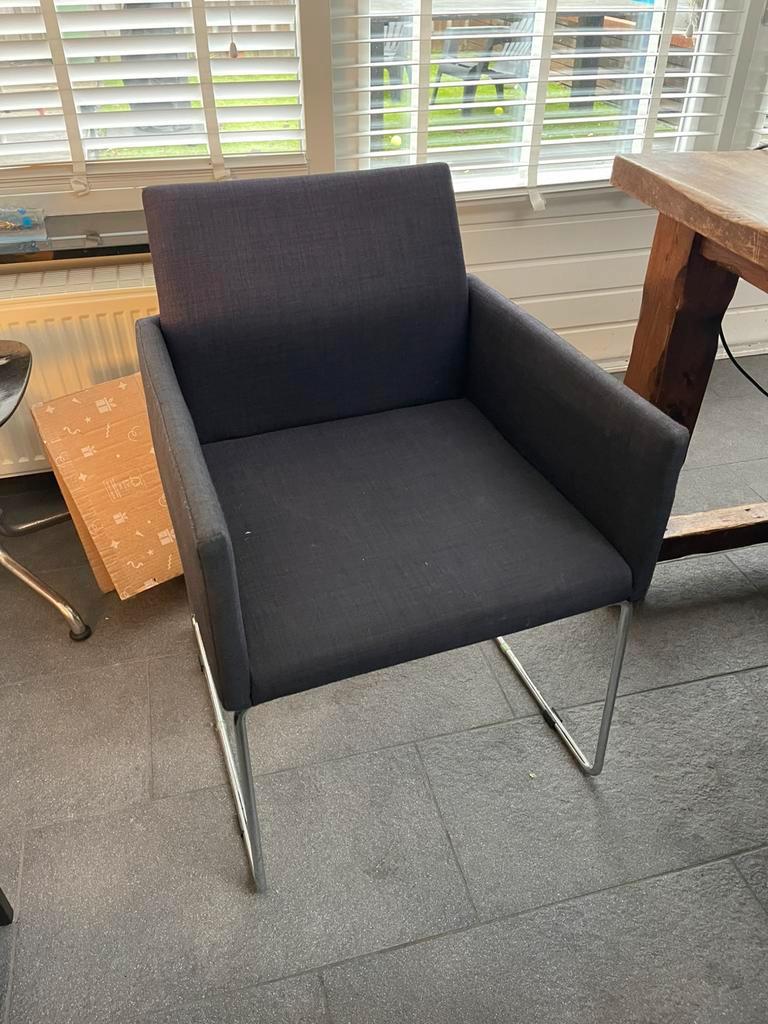 3 eetkamerstoelen gratis op te halen. Donkerblauw stof met chrome onderstel.