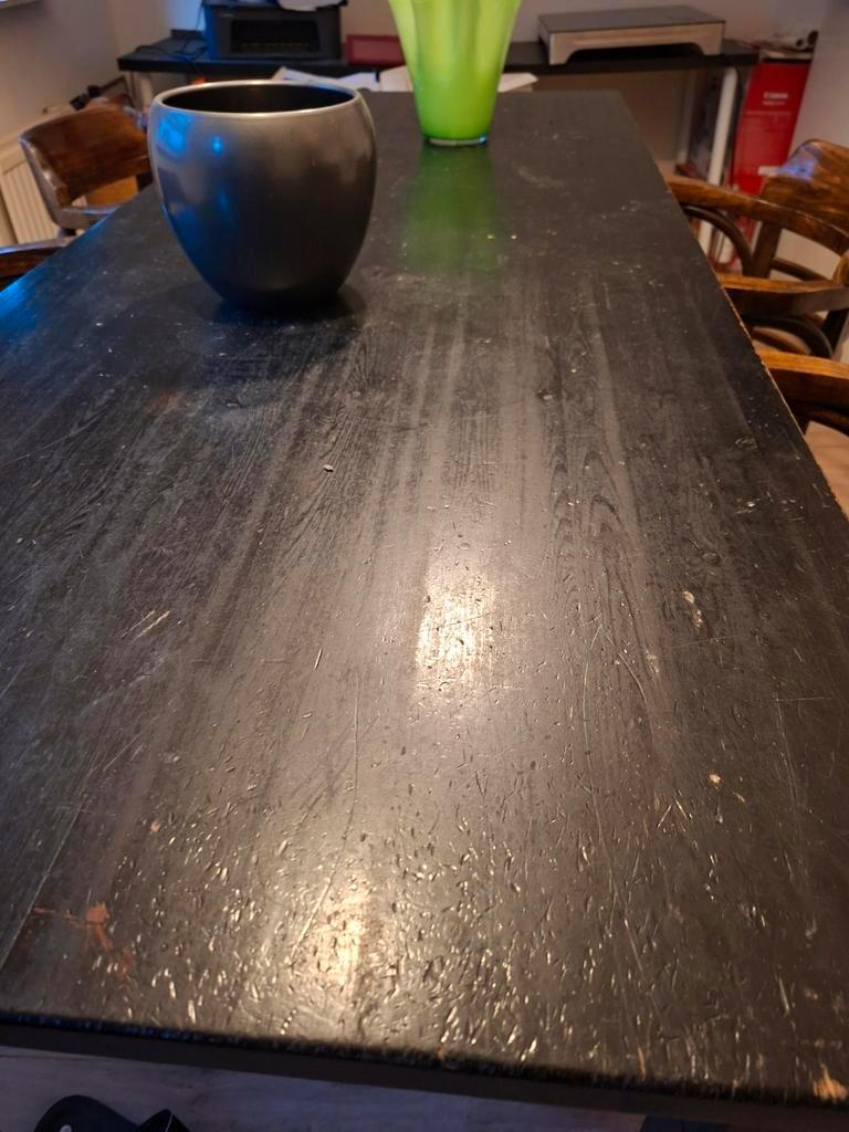 Zwarte tafel. 200 Cm bij 77 cmde conditie is . Heeft zeker een.lik verf nodig. Verder een prima tafel