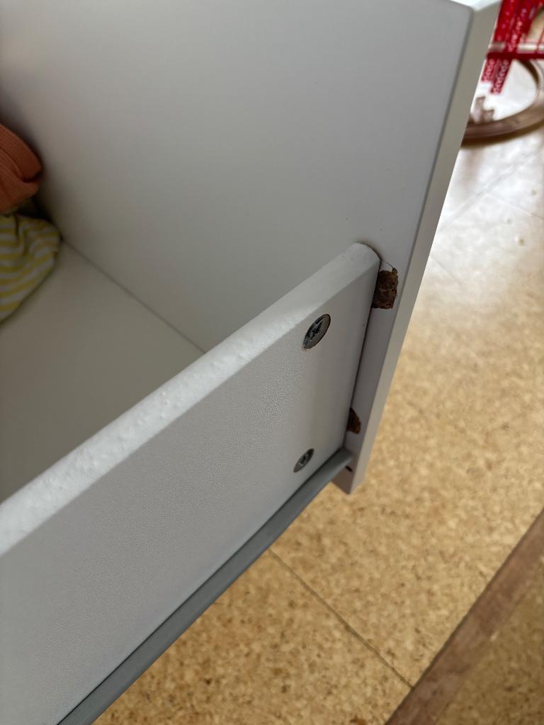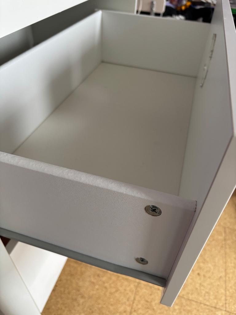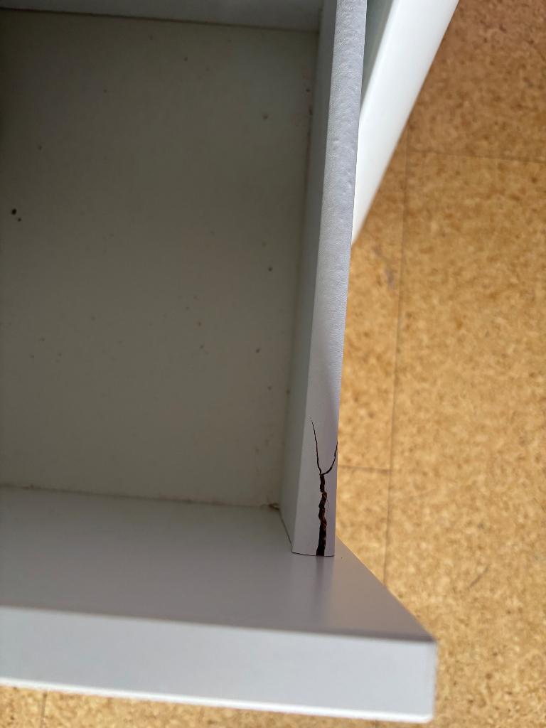 Nog prima te gebruiken. Buitenkant nog helemaal netjes. Tijdens het verhuizen is de onderste la een keer gevallen en daardoor beschadigd. Zie foto 3 en 4.