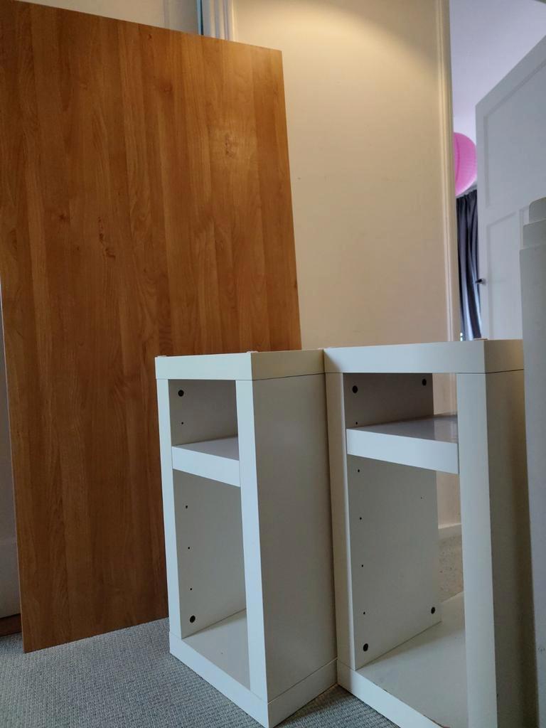 Gratis bureau bestaande uit een blad van 80cm x 160cm x 23mm en twee kastjes van 35cm x 58cm x 69.5Cm. Het bureau is gebruikt, zie de foto''s voor de staat. Afhalen in haarlem-noord