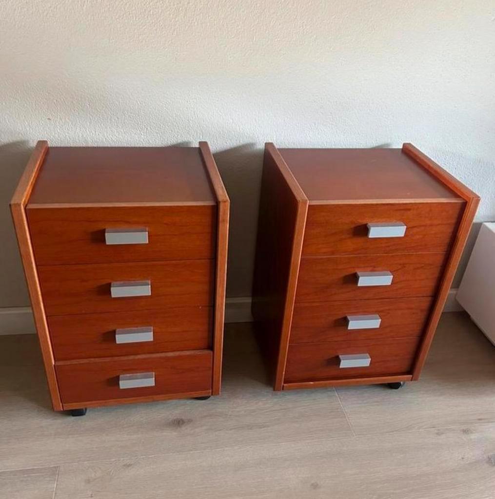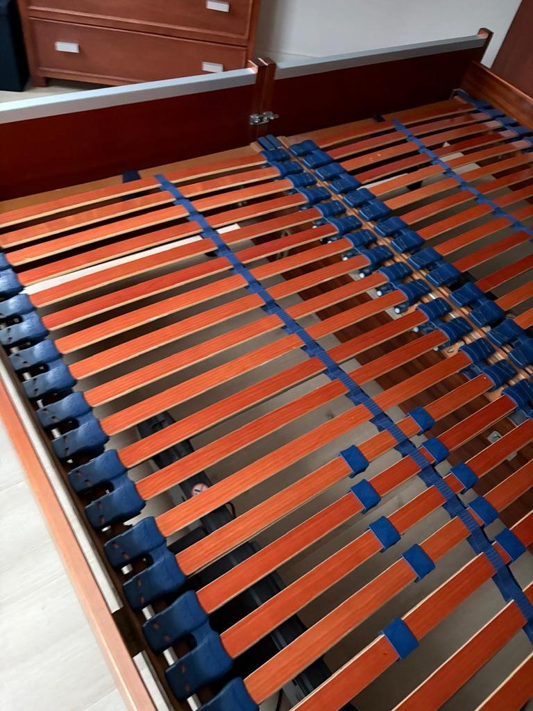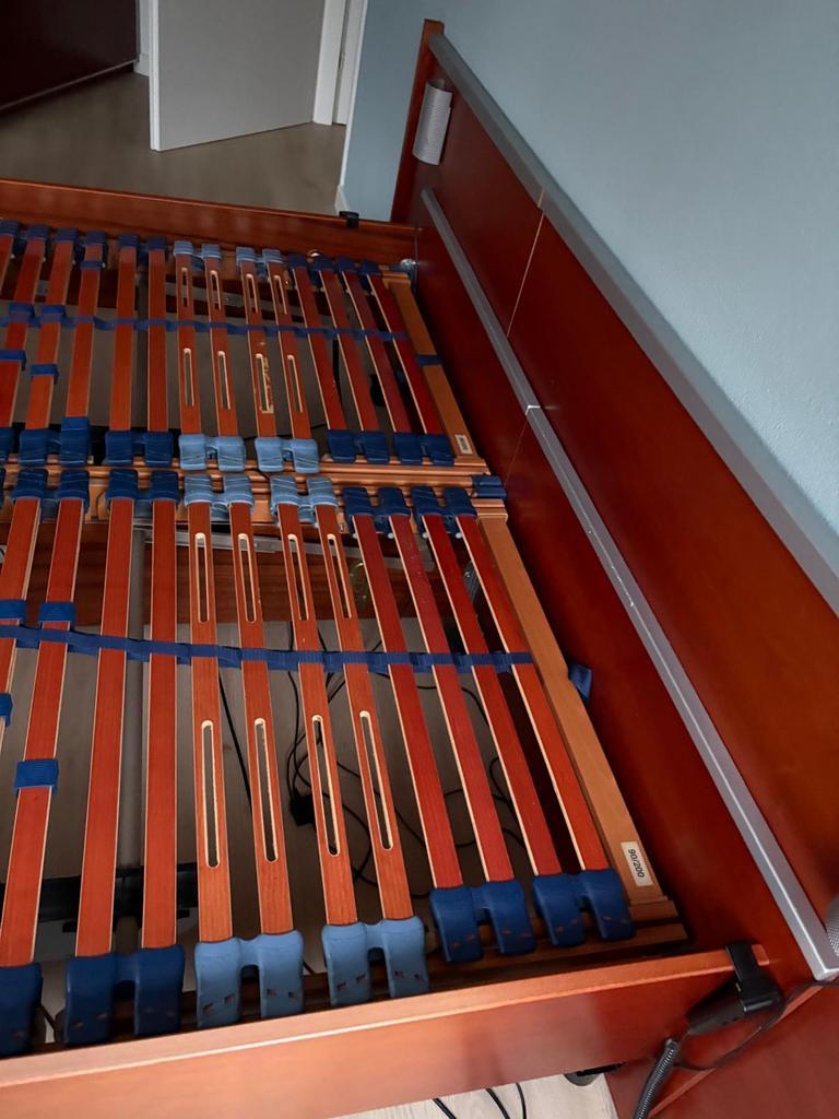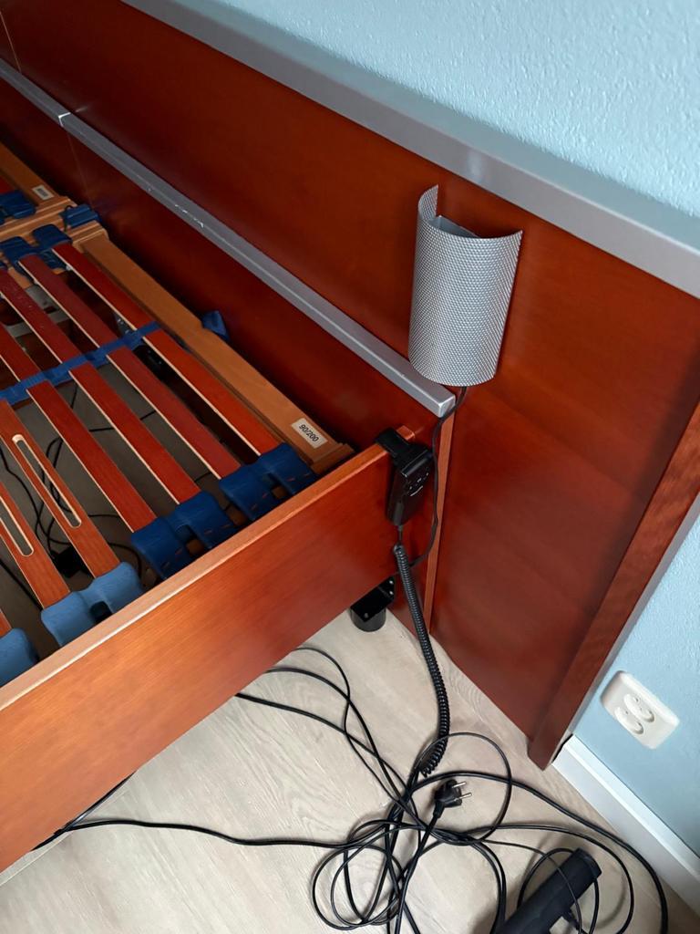 Moet dit weekend weg! Af te halen in teteringen in nette staat! Mooi kersenhouten bed met verstelbare lattenbodems, nachtlampjes en nachtkastjes op wieltjes. De bedden zijn los te koppelen zodat je er
