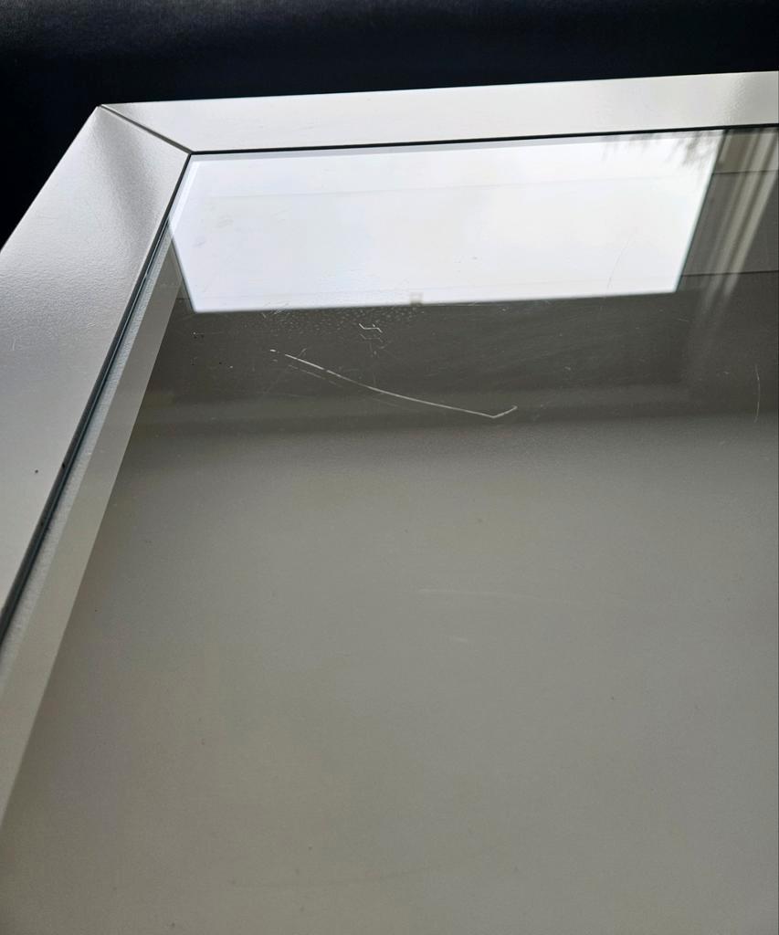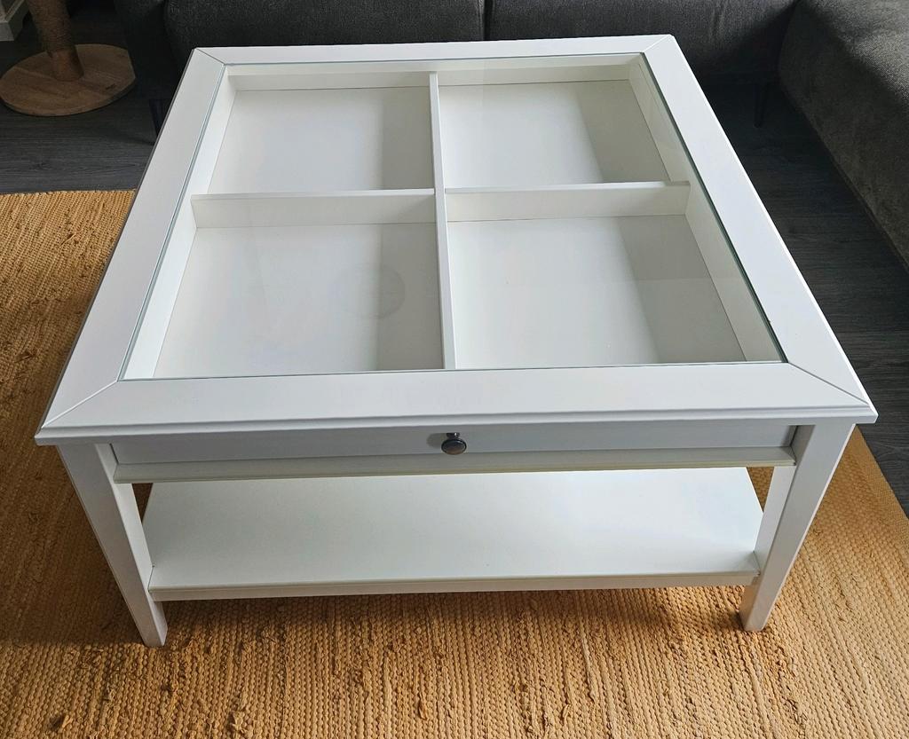 Salontafel met lade en glazen bovenkant. 94X94x50cm lxbxh, ladiepte 6cm vier lichte krasjes in het glas van ongeveer 5 cm, die bij de meeste lichtinvallen niet te zien zijn.