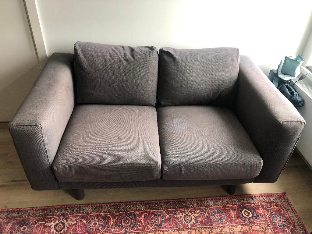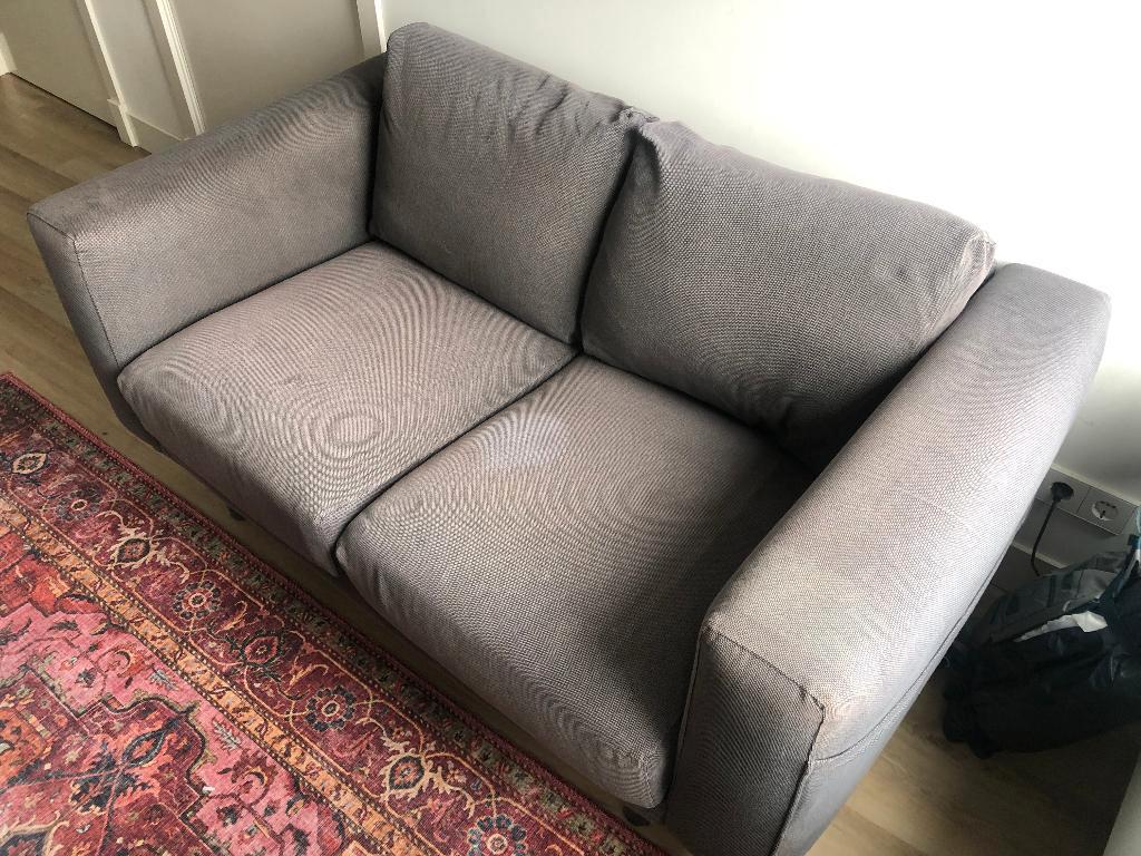 Grijze ikea bank, 2-zits de bank zit nog goed! De stof is wel wat verkleurd. De bekleding kan afgeritst worden en in de wasmachine. Er zit echter wel een vlek in de bekleding die er niet meer uit gaat