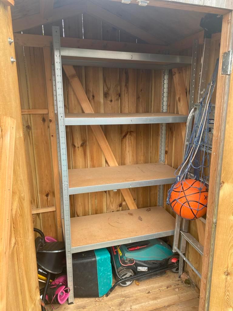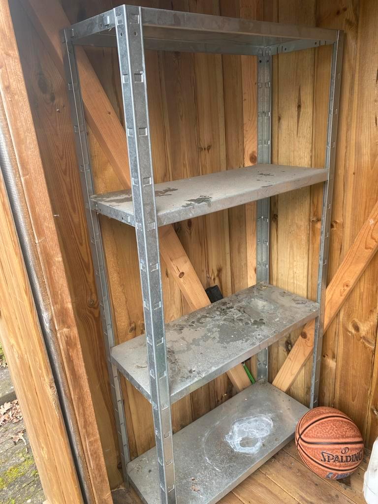 Gebruikte metalen stellingkast met 4 planken. Ideaal voor opslag in garage, schuur of kelder. De kast is stevig en functioneel, maar vertoont gebruikssporen. Afmetingen zijn ongeveer 160-180cm hoog, 9