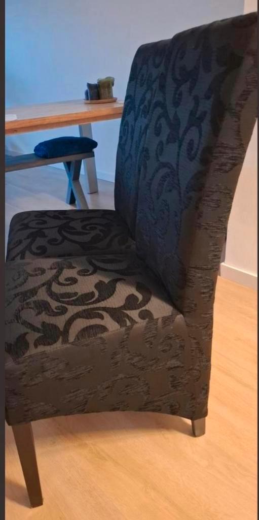 Set van twee zwarte eetkamerstoelen, met een ingewerkt patroon. Gebruikt, maar in goede staat. Moeten snel weg.