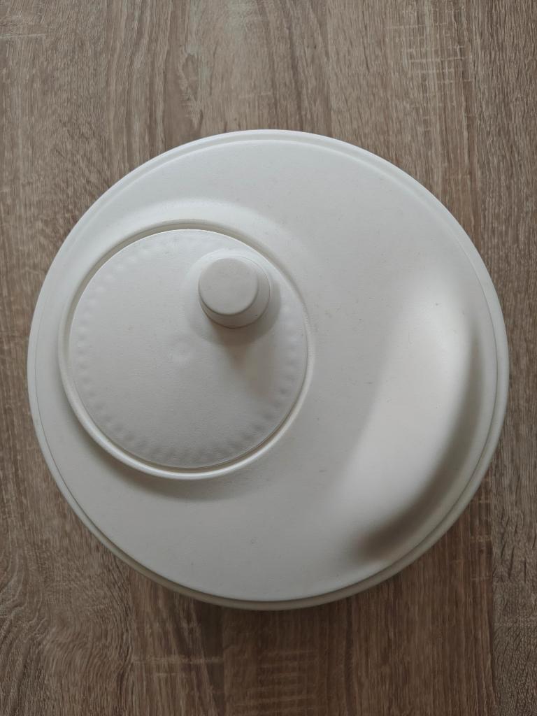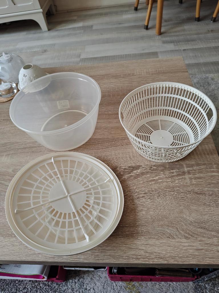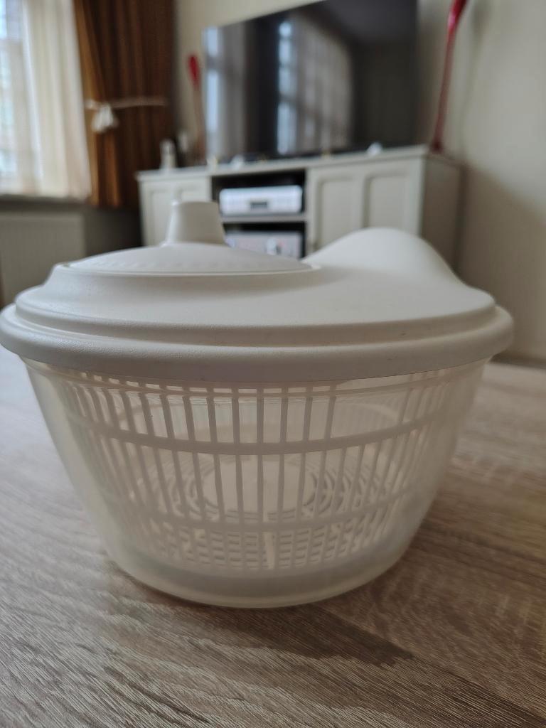 Witte plastic slacentrifuge. Merk: ikea. Afmetingen: 17 cm (hoogte) 23 cm (doorsnede) wij hebben een andere gekocht (bij de kringloop hoor) die minder ruimte inneemt.