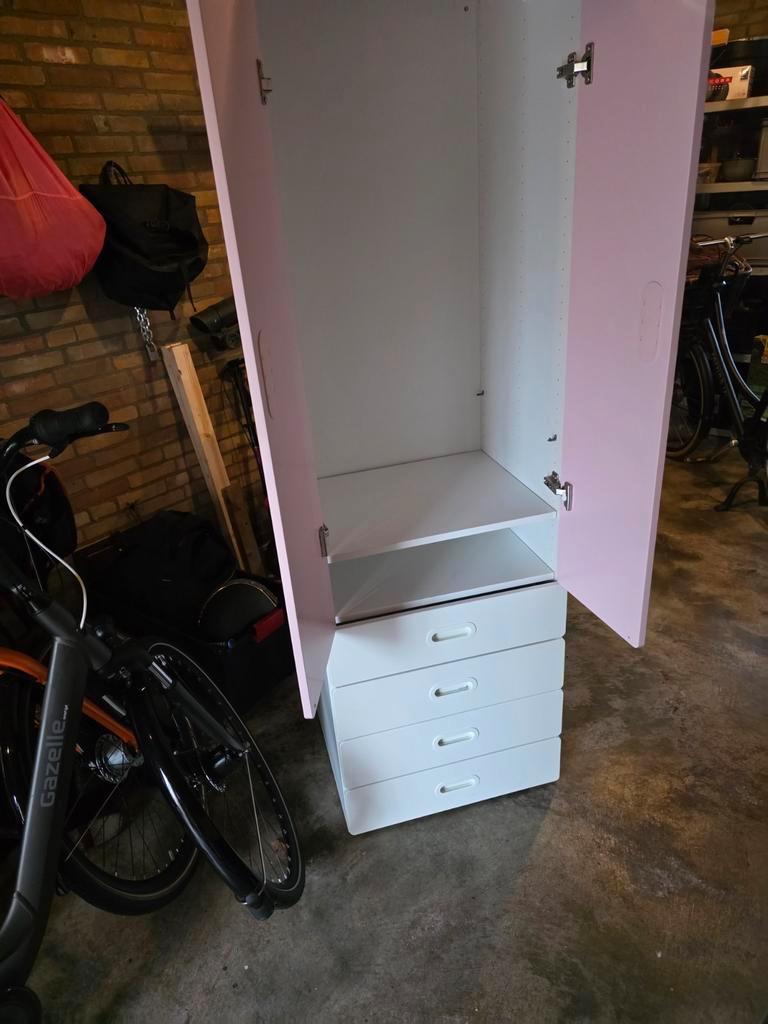 Zeer nette ikea kledingkast met roze deurtjes. Gratis af te halen vandaag! De kast heeft zowel deuren als lades, waardoor er voldoende opbergruimte is. Ideaal voor een kinderkamer.