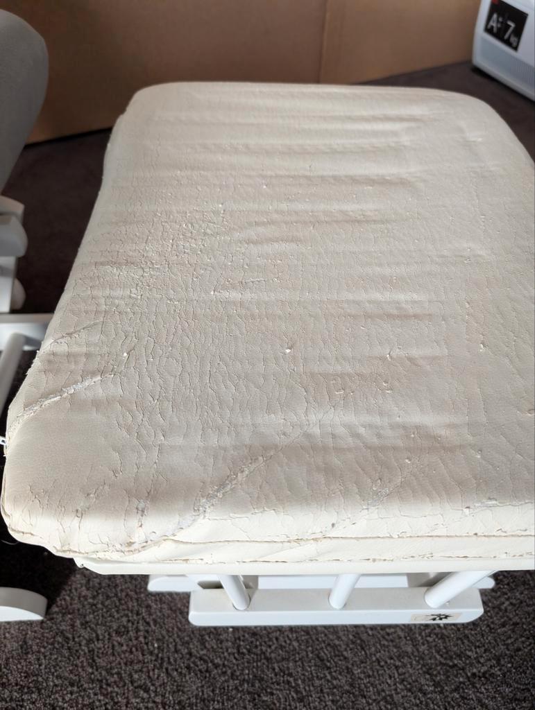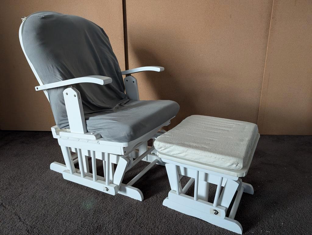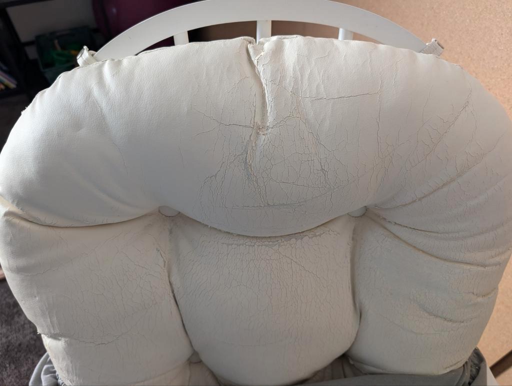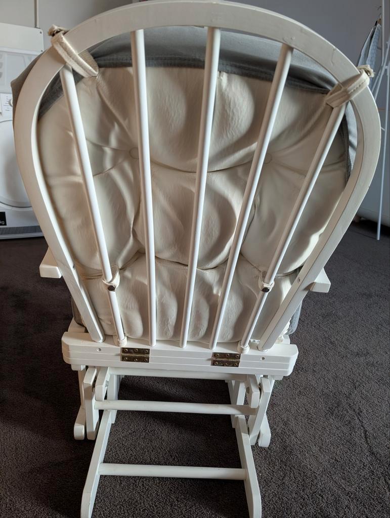 Gratis schommelstoel. Het leren bekleding is sterk beschadigd. Daarom hebben wij de stoel bedekt met een kinderbedhoes (zie foto’s). De stoel is erg comfortabel, schommelt goed en is altijd fijn in ge