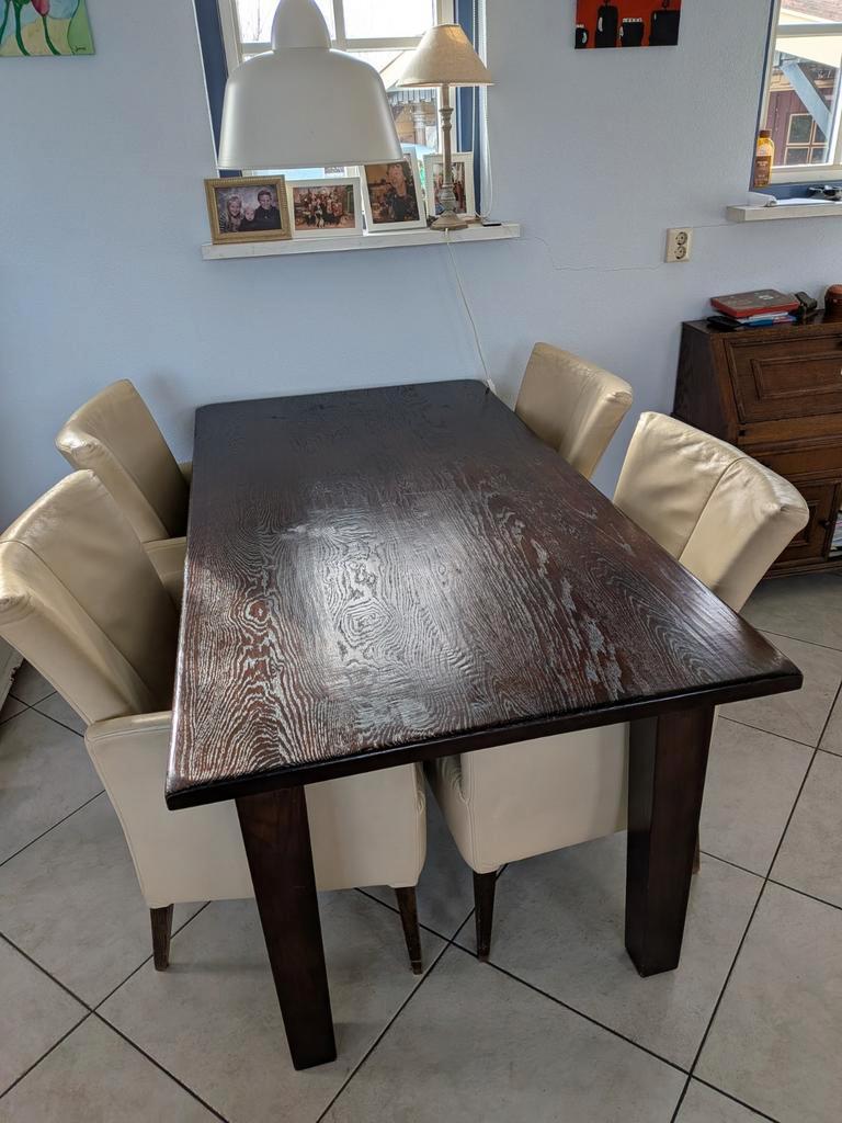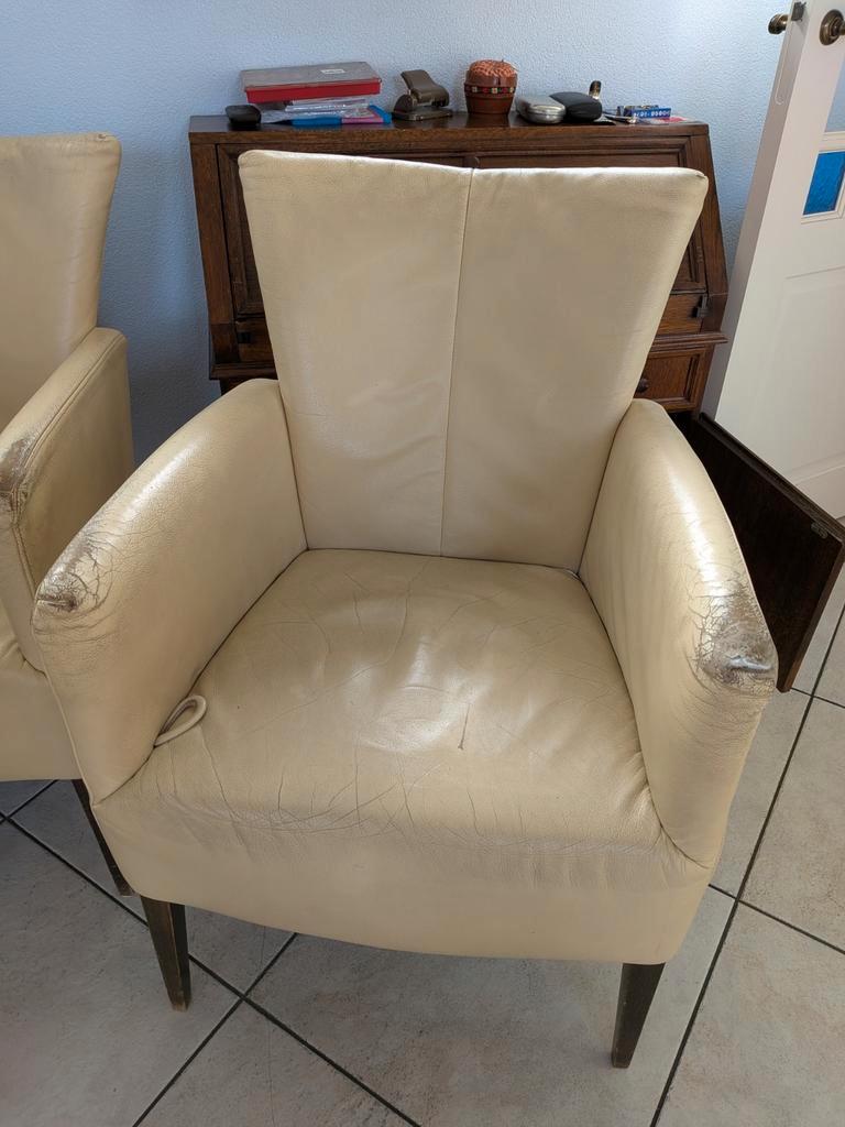 4 eetkamerstoelen, mogen gratis opgehaald worden, ze zitten nog goed er zitten alleen slijtplekken op de armleuning.