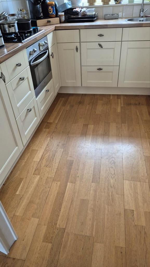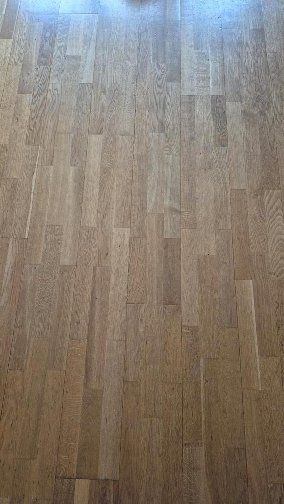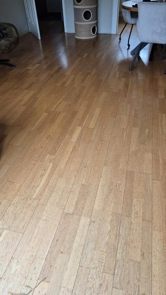 Nog goede lamelparketvloer, kan nog zeker 2x geschuurd en gelakt worden, ongeveer 40m2