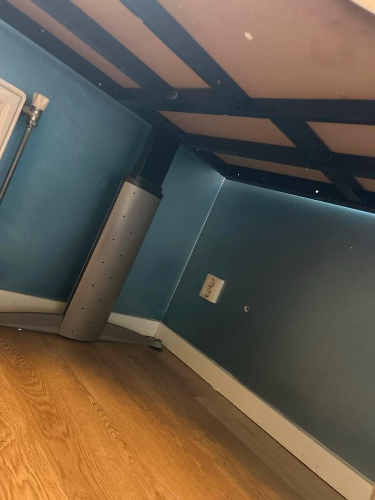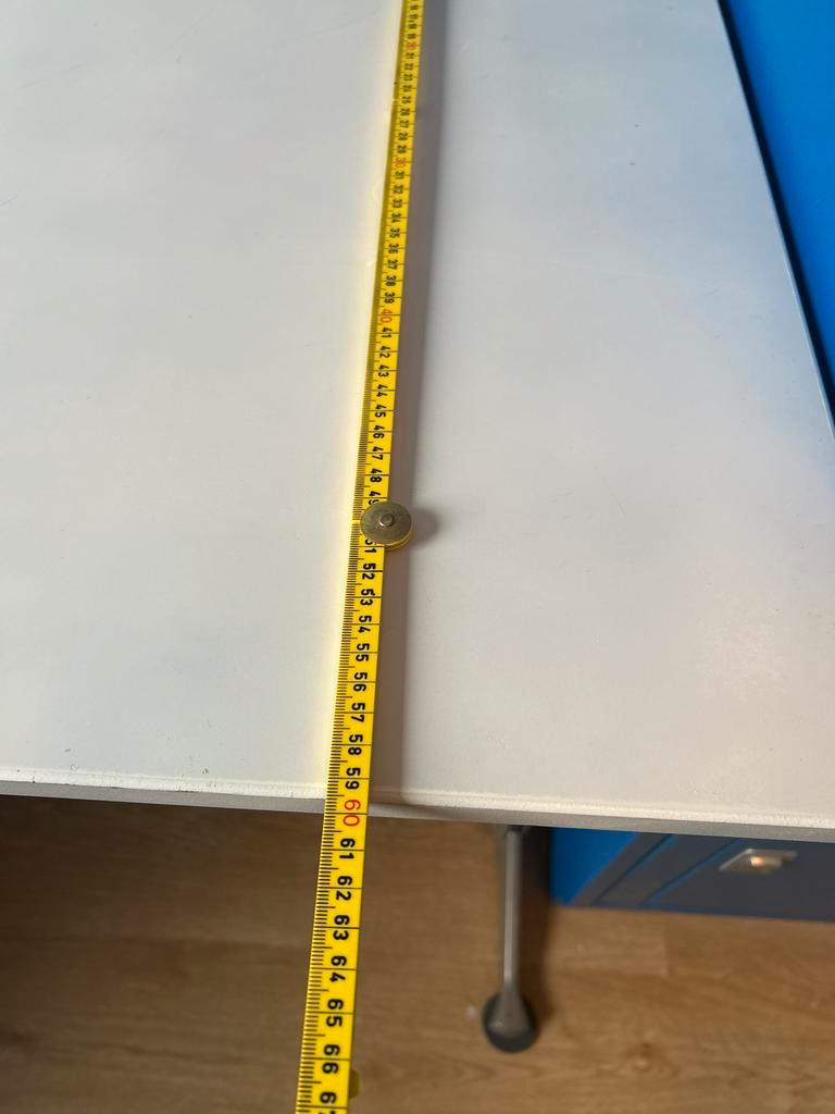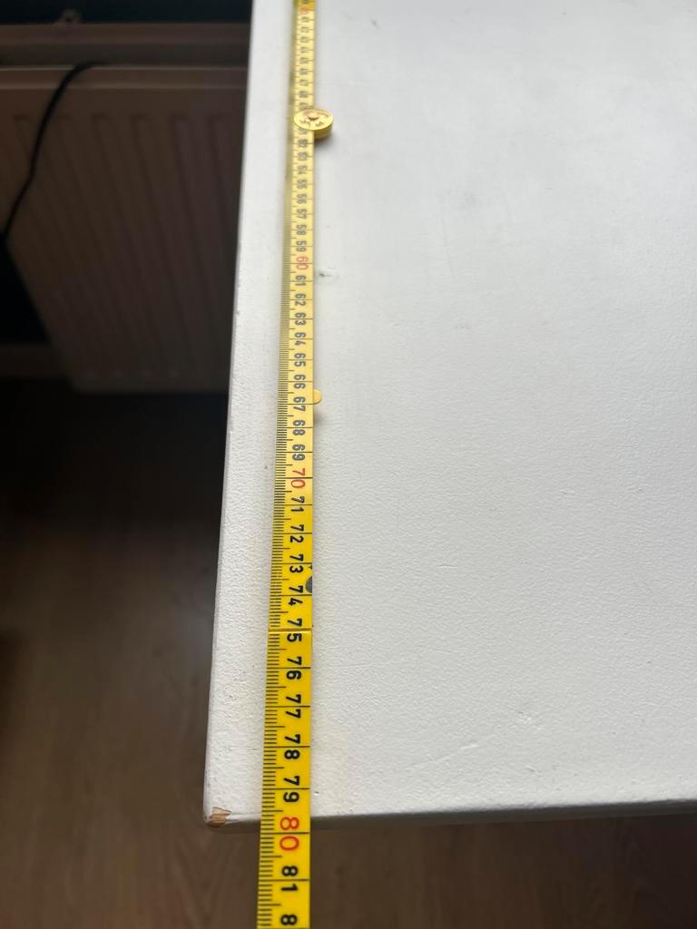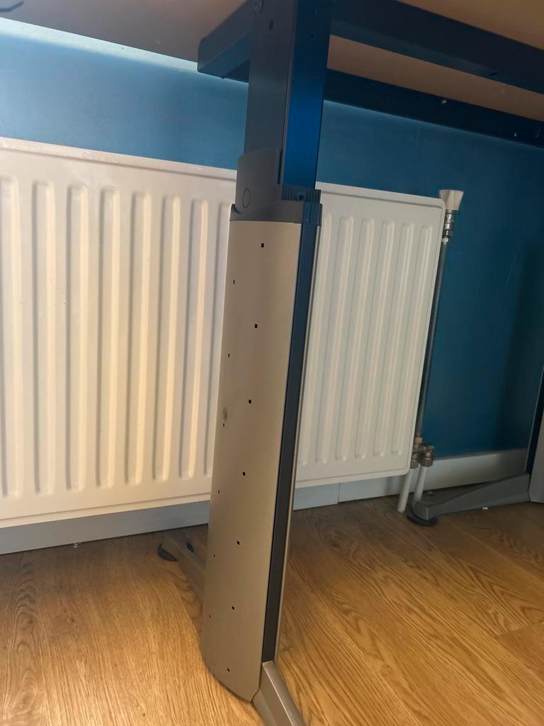 Hoekbureau met afmetingen 200 x 160 cm. De linkerkant is 80 cm diep, de rechterkant 60 cm. Het bureau is demontabel en kan in delen worden vervoerd. Ideaal voor een kantoor of studeerkamer.