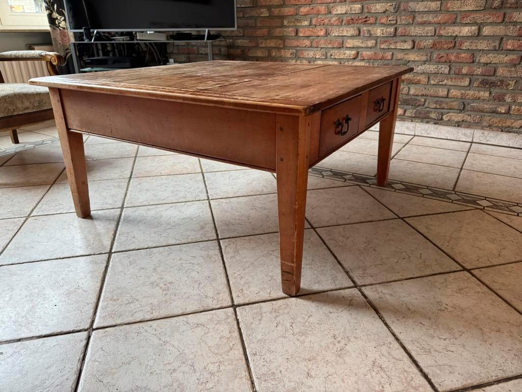 Mooie houten salontafel met handige lades. De tafel is in gebruikte staat en heeft een rechthoekige vorm. Het materiaal is voornamelijk hout. De afmetingen zijn ongeveer 100-150 cm breed en lang, en m