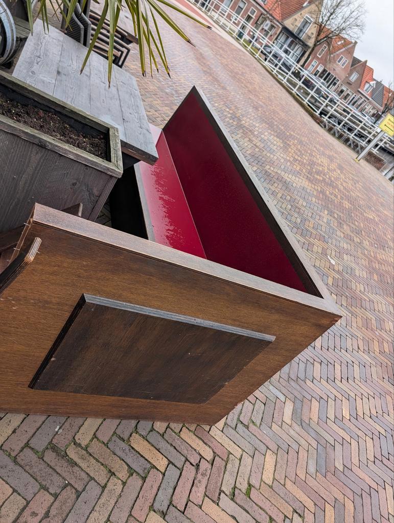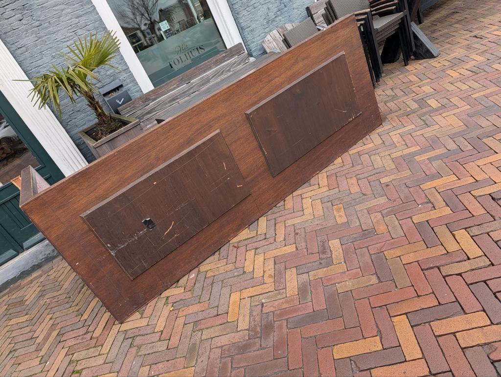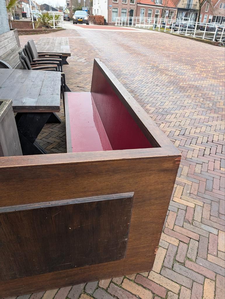 Oude houten hoekbank met afmetingen: 2.56 Meter lang, 1.21 Meter hoekdiepte, 50 cm normale diepte en 93 cm hoog. Moet nu weg want ligt al buiten!