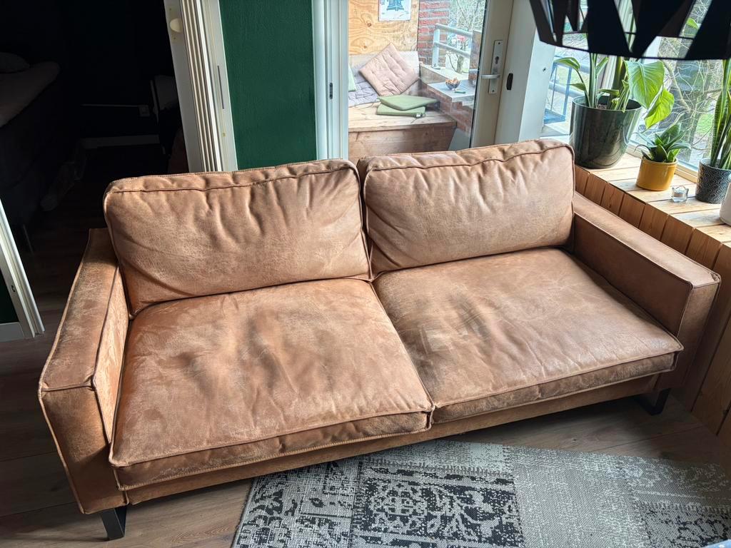 Mooie cognac kleurige zitkamerset met stalen afwerking. Bestaat uit een 3-zits bank (210x97), en een poef (120x40). De set is in goede staat en gaat weg in verband met een verhuizing. . Zelf naar bene