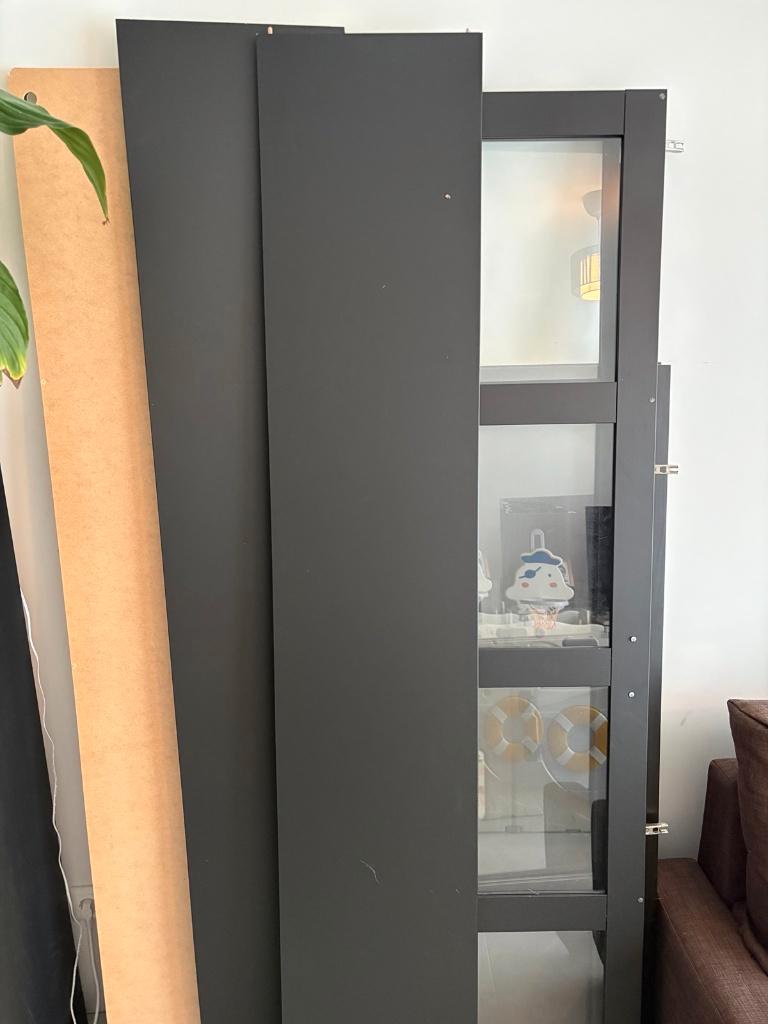 De kast is uit elkaar en er zijn beschadigingen in de houtplaat die op de achterkant van de kast getimmerd moet worden, deze is namelijk niet soepel eraf gegaan. Er zijn wat scheuren waar de nagels ge