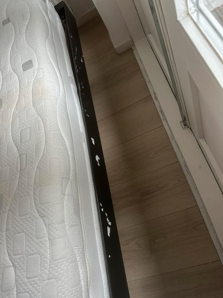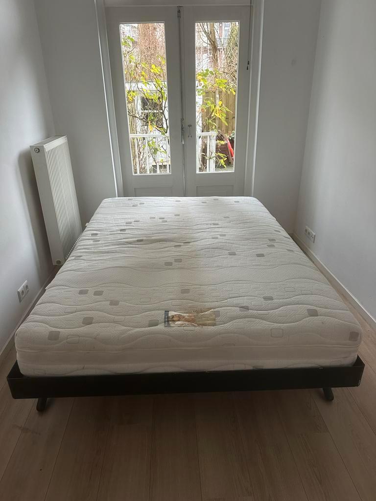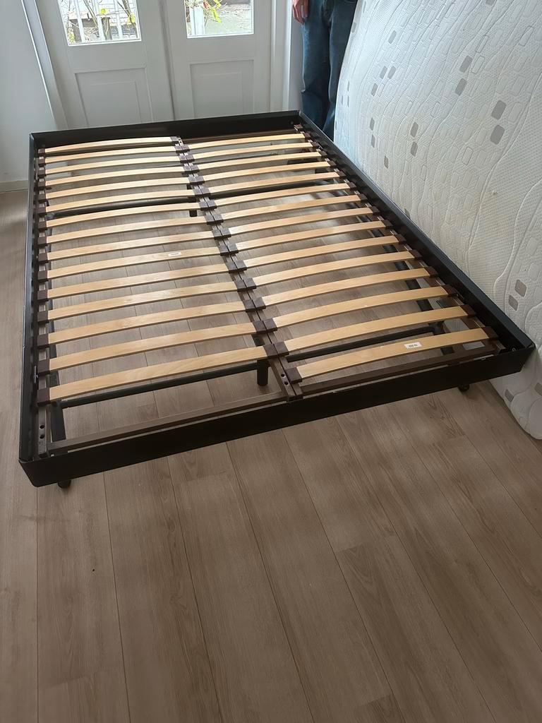 Gratis op te halen: bedframe met matras (140x200 cm). Het frame heeft kleine beschadigingen en er missen 2 latjes (zie foto). Ophalen vandaag of uiterlijk morgen.