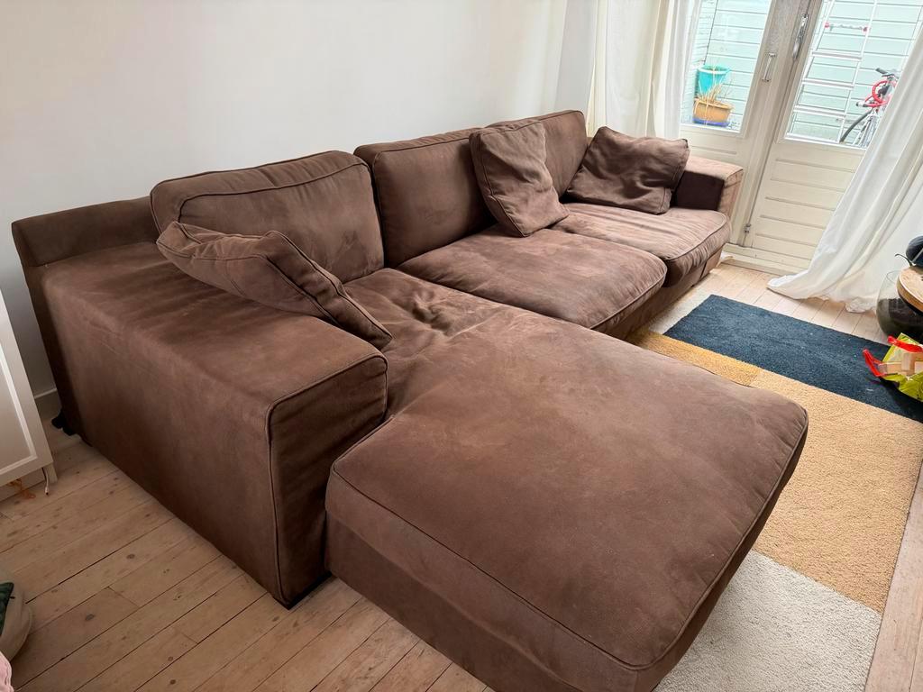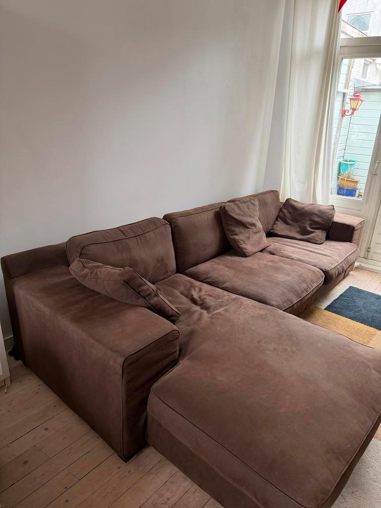 Deze bruine bank zit heerlijk en mag gratis worden opgehaald vanwege een verhuizing.